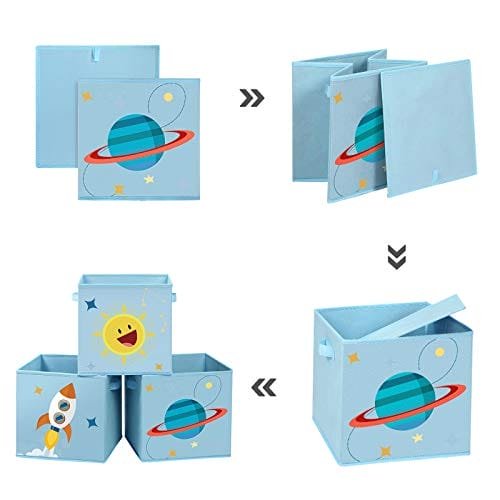 Vad du får: En uppsättning av 3 blå förvaringsfack med en rymd-tema design och två sidohandtag-erbjuder dig extra utrymme för att organisera dina sysslor medan du får ditt hus att se roligare