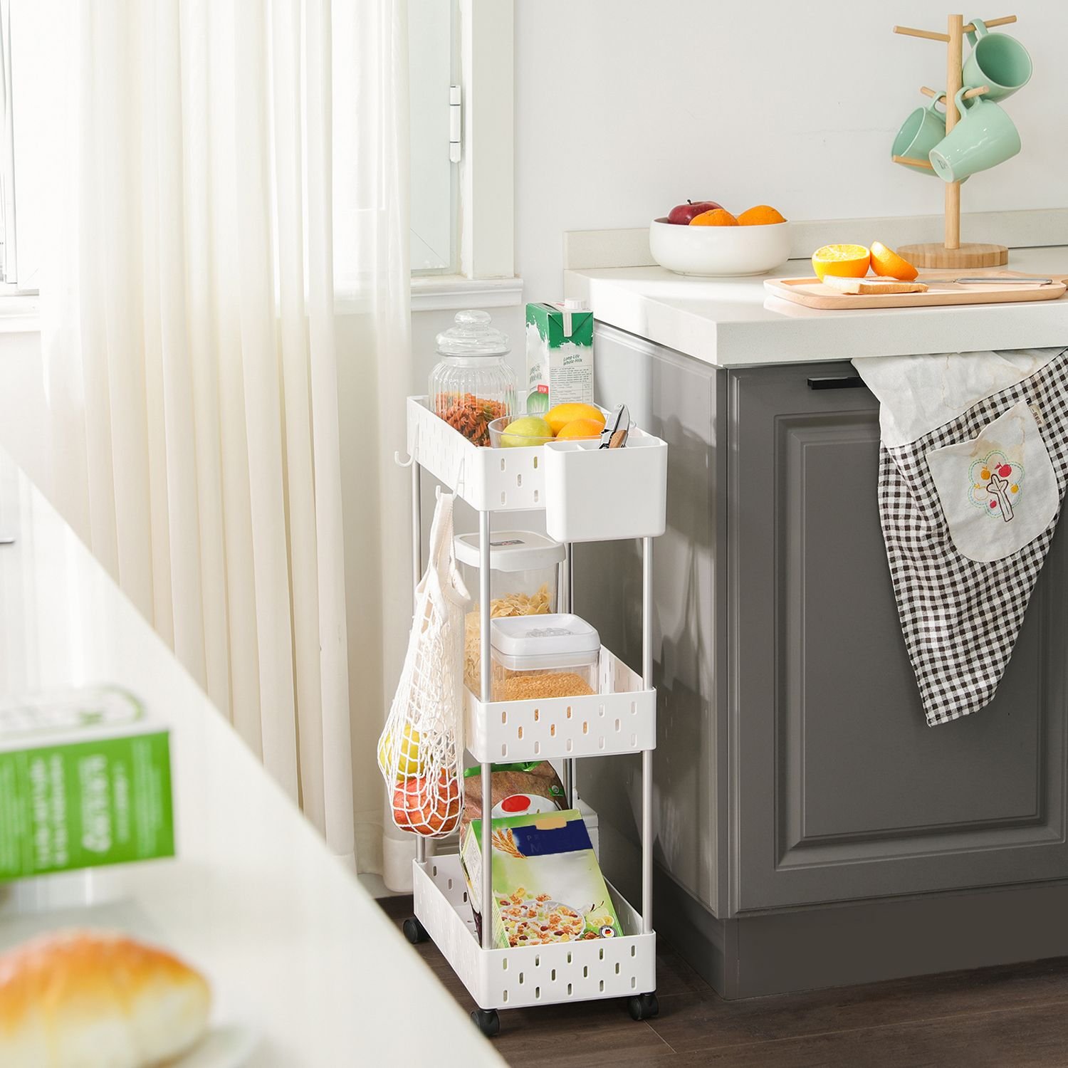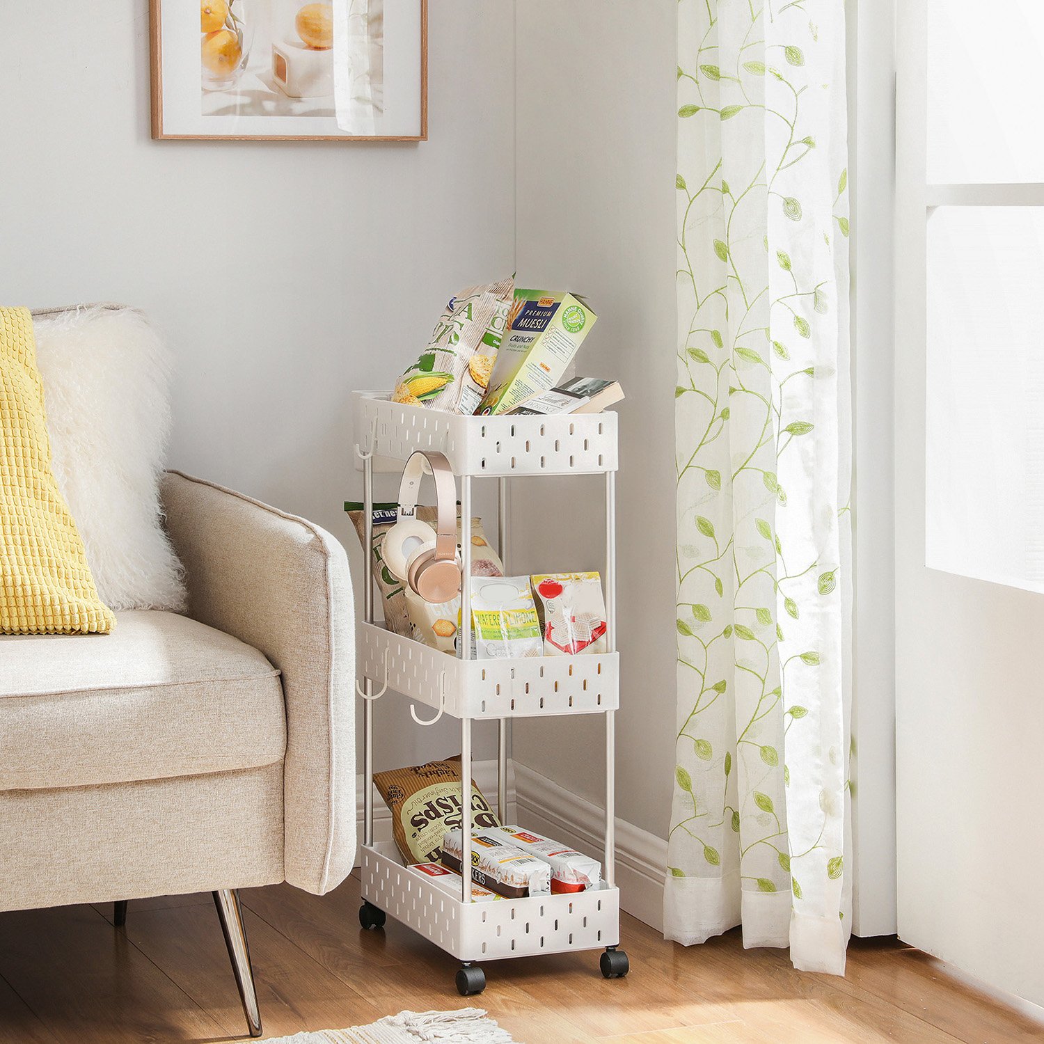 SONGMICS 3-Tier Storage Trolley, Rolling Cart with Wheels, Bathroom Shelf with 6 Removable Hooks, 1 Tray, 1 Container, for Kitchen, Living Room, 38 x 22 x 72 cm, White KSC011W01