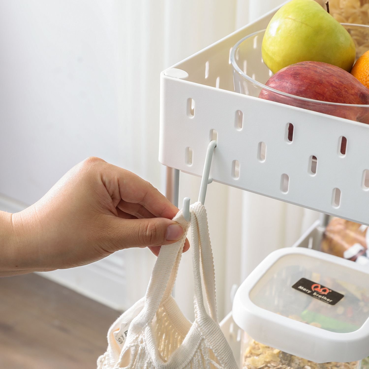 WHAT YOU GET: A 3-tier shelf with 4 wheels, removable accessories (6 hooks, 1 tray, 1 container) that can be attached to any hole on the rack, hollow-out design for good ventilation, and a clean look that will adorn your bathroom, kitchen, or living room