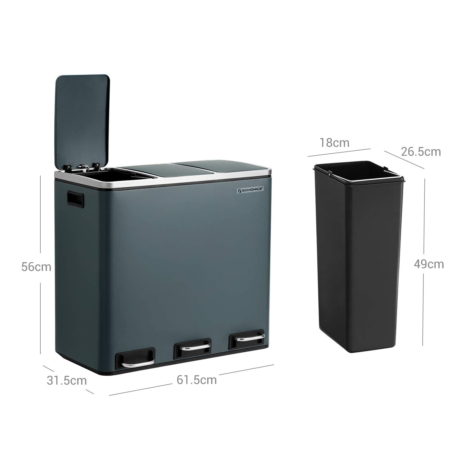 Specifications:Colour: Grey, BlackMaterial: Steel, ABS PlasticTotal Product Size: 60.4 x 30 x 56.3 cm (L x W x H)Each Inner Bucket Size: 18 x 26.4 x 49 cm (L x W x H)Total Height with Lid Open: 82 cmProduct Weight: 7.5 kg Package Contents:1 x Rubbish Bin
