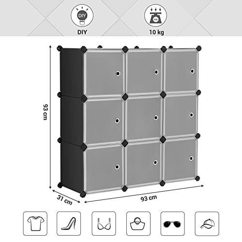 Songmics 9-Cube förvaringsorganisatör, plastskåp med dörrar, för kläder, skor, svart