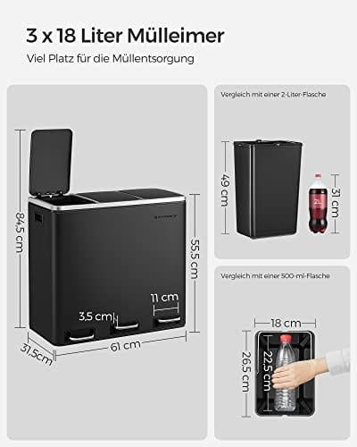 Vad du får: En svart skräpfack med 3 x 18L-fack, praktiska pedaler och avtagbara inre hinkar för enkel avfallshantering och problemfri återvinning