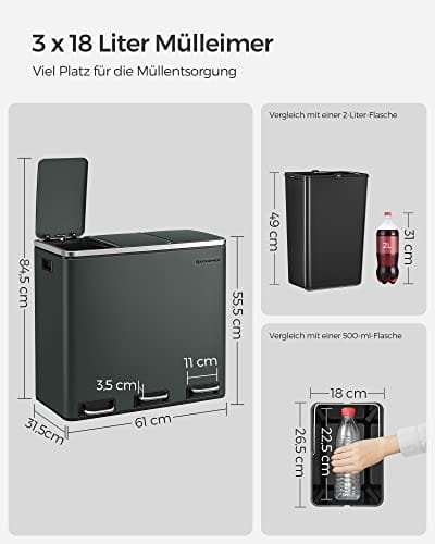 Vad du får: En antracitgrå skräpfack med 3 x 18L-fack, praktiska pedaler och avtagbara inre hinkar för enkel avfallshantering och problemfri återvinning
