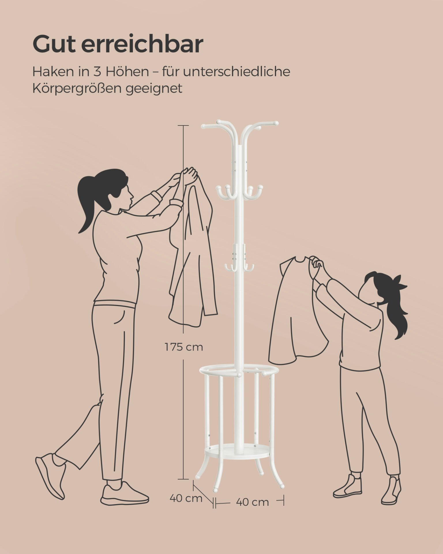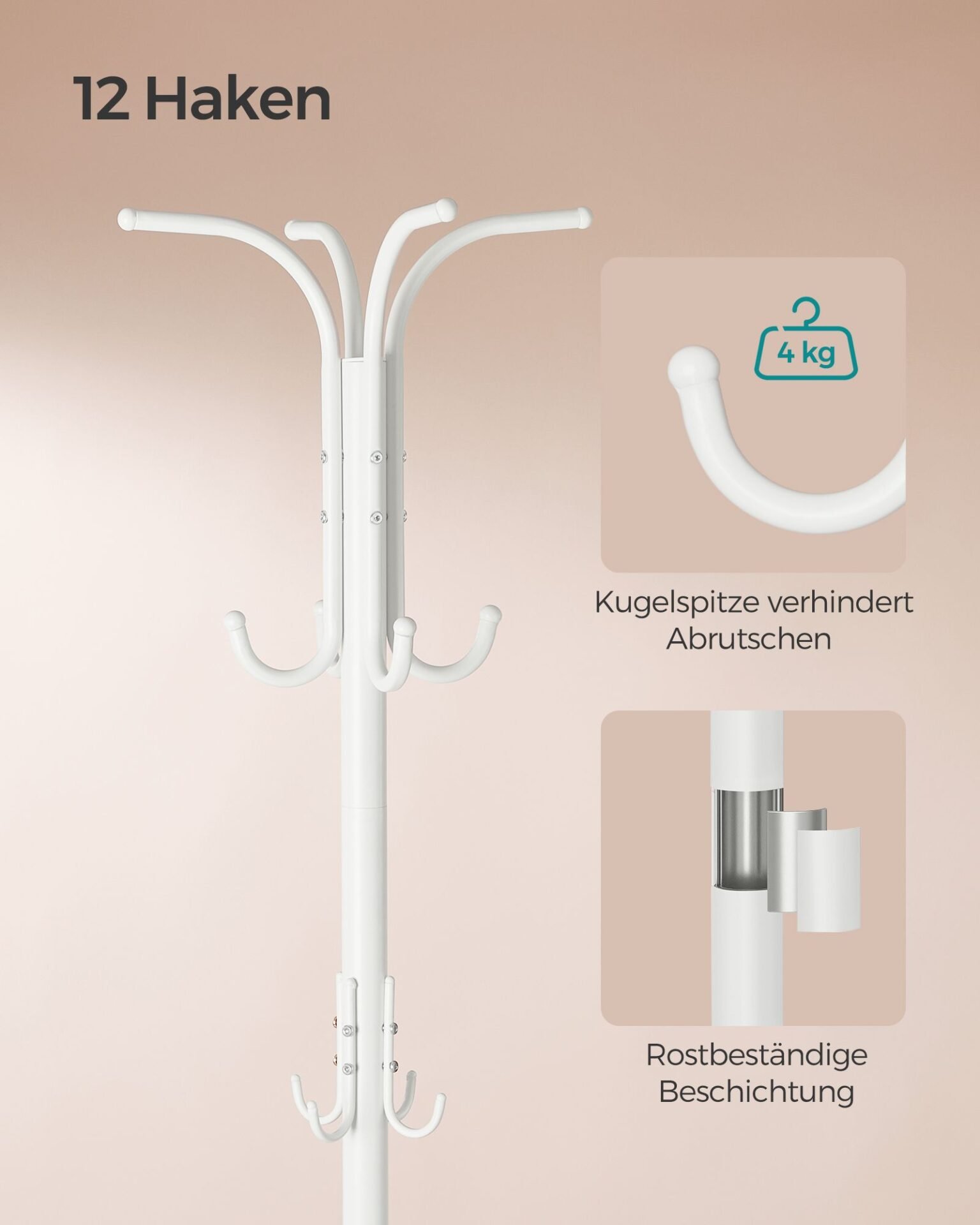 [Hang with Ease] With 4 sturdy legs and a low, stable centre of gravity, this coat rack allows you to confidently hang heavier coats and bags on 12 robust hooks (each hook holds up to 4 kg), ensuring your items stay securely in place