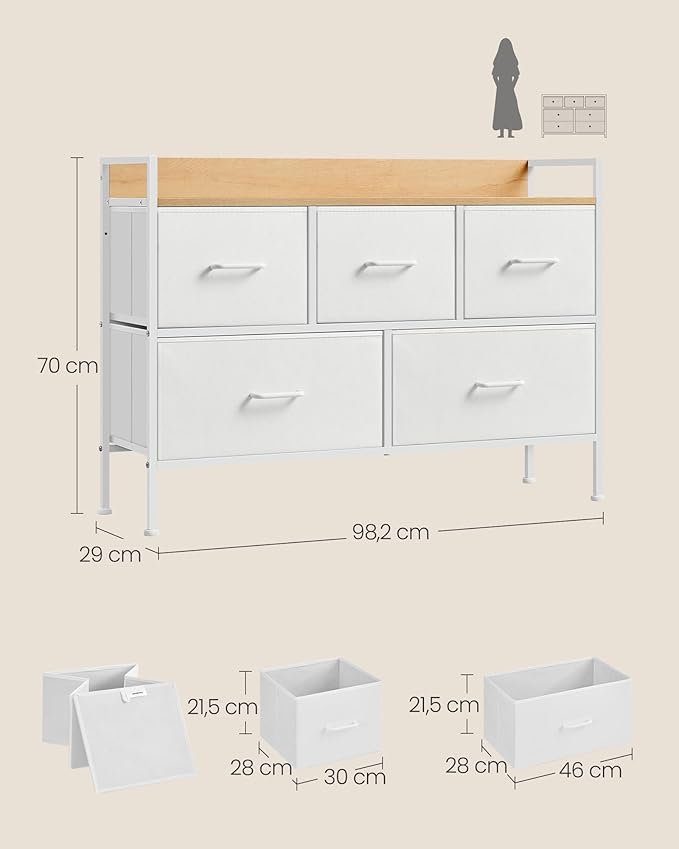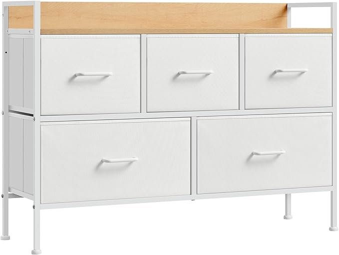 SONGMICS Commode, Armoire, Meuble de Rangement, 5 Tiroirs en Tissu avec Poignées, Cadre en Métal, Style Moderne, Blanc Nuage et Beige Chêne LTS135W01