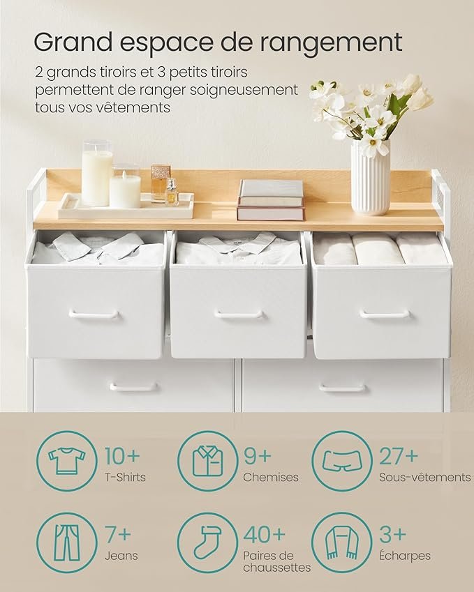 【POUR RANGER ET TRIER】Avec 5 tiroirs (2 grands et 3 petits), rangez vos affaires par catégorie. Chaque grand tiroir accueille 60-70 chaussettes, 13-16 T-shirts ou 7-11 pantalons, chaque petit accueille 40-45 chaussettes, 9-10 T-shirts ou 4-7 pantalons
