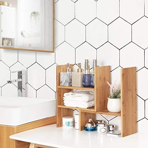 Beställningen behöver inte vara monoton: använd inte kalla, styva metall- eller plasthyllor. Lägg till en varm atmosfär till ditt utrymme med denna vackra och hållbara bambuhylla.