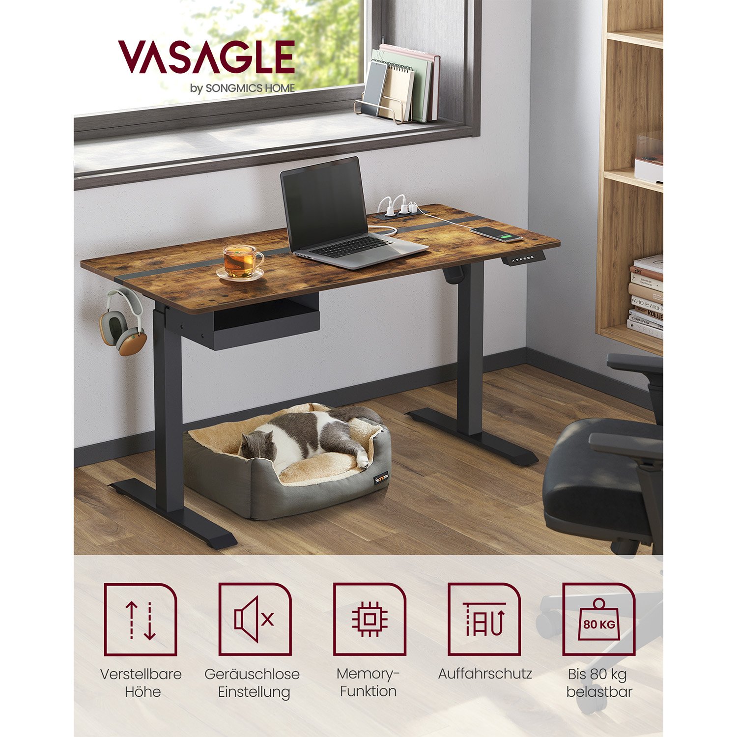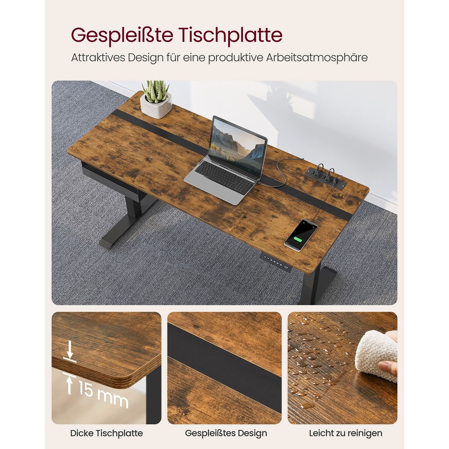 ADJUSTABLE HEIGHT AND MEMORY FUNCTION: This table is infinitely adjustable in height between 72 and 120 cm and has a very low noise level during height adjustment (< 50 dB). A total of 4 heights can be saved as quick settings. Built-in socket and built-in wiring: with 2 charging contacts and 2 USB ports, thanks to the integrated wiring, only one cable is needed to power the motor and charge the mobile phone and other devices together. Spliced Tabletop:Different colors and matching connection conditions add style to this desk stand and create a productive working atmosphere. DRAWER & HOOKS A small drawer (22.7 x 32.5 x 4.0 cm) for office supplies, the top of the drawer for laptop or documents; The hook on the side can be used for hanging headphones to ensure easy access. Sturdy and stable: double support beams and sturdy legs provide stable support (load up to 80kg); the adjustable legs can be replaced by 4 wheels with brakes, thanks to the brakes, you don't have to worry about stability. Model NumberLSD114X01ColourVintage Brown and Black.Product Dimensions60 x 140 x 120 cm; 31.6 KilogramsMaterialEngineered Wood Alloy SteelSpecial FeaturesAdjustable HeightItem Weight31.6 Kilograms
