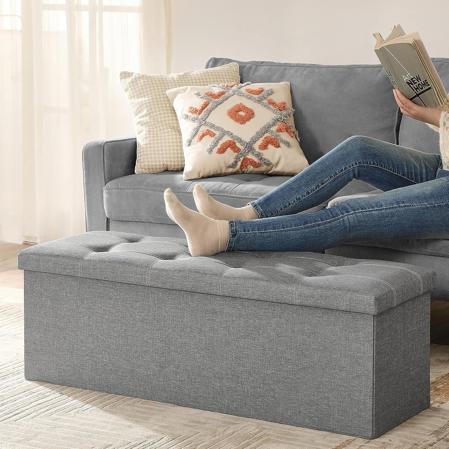 Elegant and comfortable: thanks to the simple look and subtle colour, this bench fits perfectly with different interior styles. In addition, the well-padded lid and the breathable imitation linen cover ensure a high level of comfort