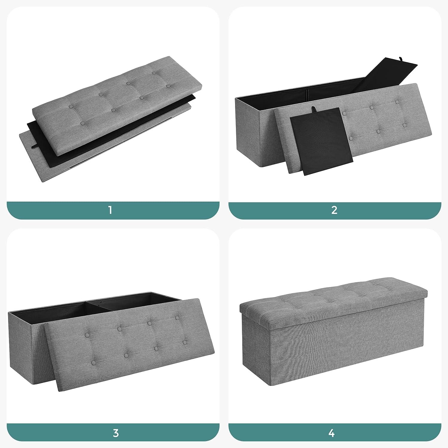 Product details:Colour: Light GreyMaterial: MDF (medium density fibreboard), faux linen cover, foamSize overall: 110 x 38 x 38 cm (L x W x H). Weight: 8.8 kg. Max. Static load capacity: 300 kgBox contents:1 x seat chest