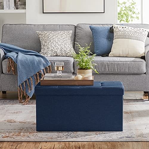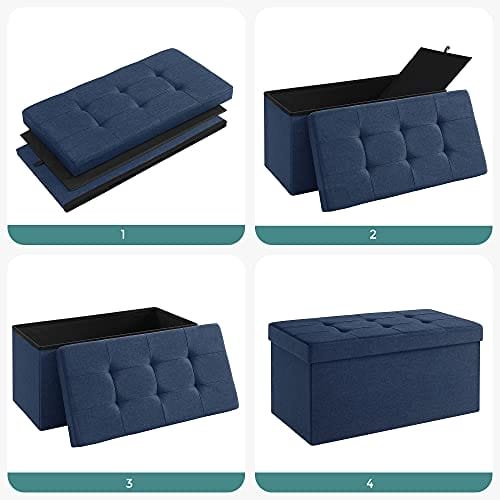 Specifikationer: – Färg: mörkblå – Material: brandsäkert linnetyg, högdensitetsskum, 9 mm tjockt MDF -kort- Produktstorlek: 76 x 38 x 38cm (LXBXH) – Vikt storlek: 76 x 38 x 5cm (LXWXH) – Inre storlek: 73 x 34 x 33,5 cm (LXBXH) – Inre kapacitet: 80 liter – Produktvikt: 6,6 kg – Max. Statisk lastkapacitet: 300 kg Förpackningens innehåll: – 1 x hopfällbar ottoman – 1 x Instruktioner (EN, DE, FR, ES, IT)