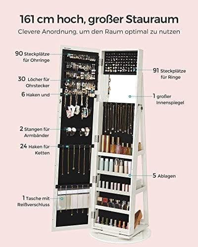 Detta 3-i-1 smyckesskåp kombinerar en klädspegel, förvaringshylla och rymlig smyckesförvaring, vilket gör det till ett oumbärligt tillägg till ditt hem. Med sin eleganta design och praktiska funktioner är det både en vacker inredningsdetalj och en smart lösning för att hålla ordning på dina accessoarer.