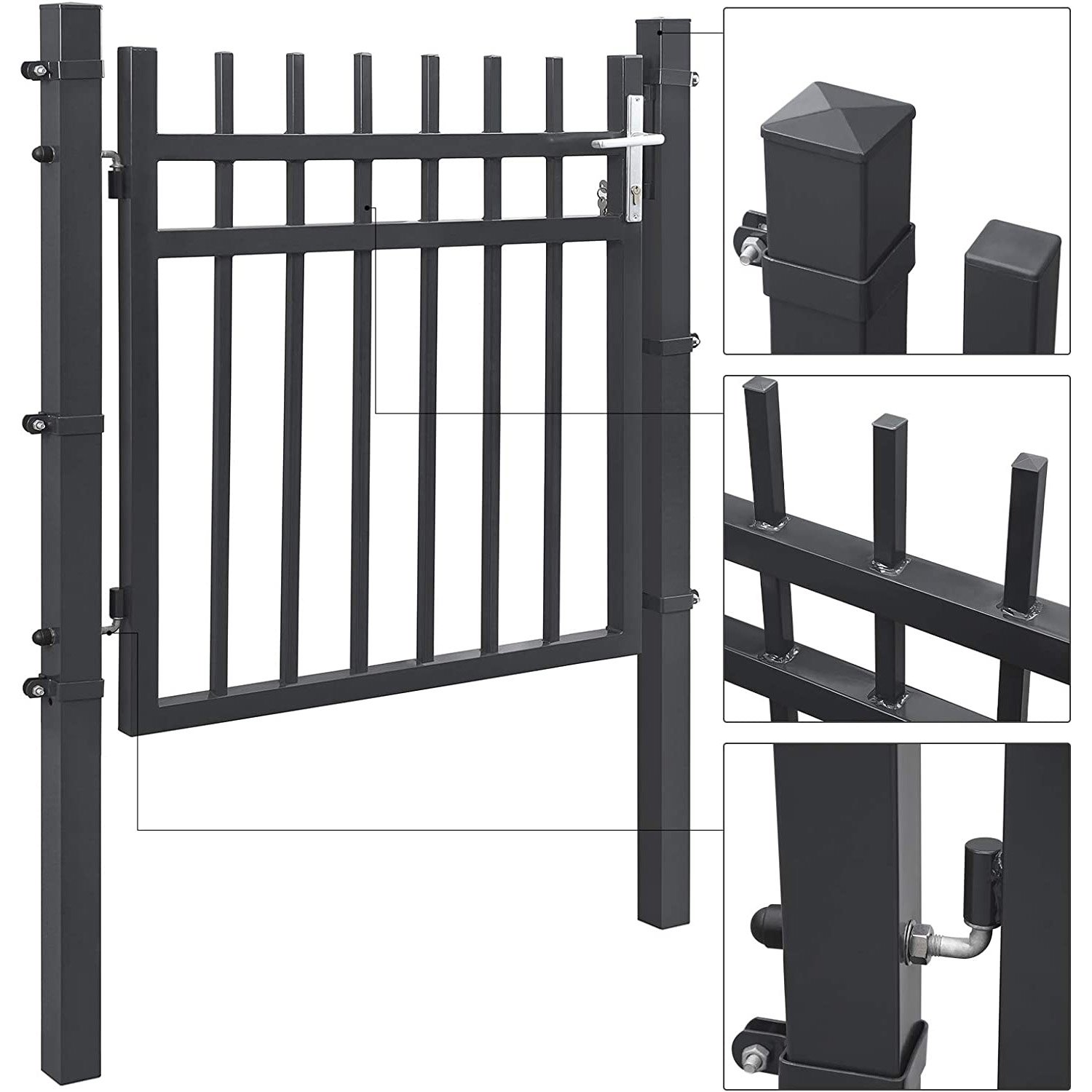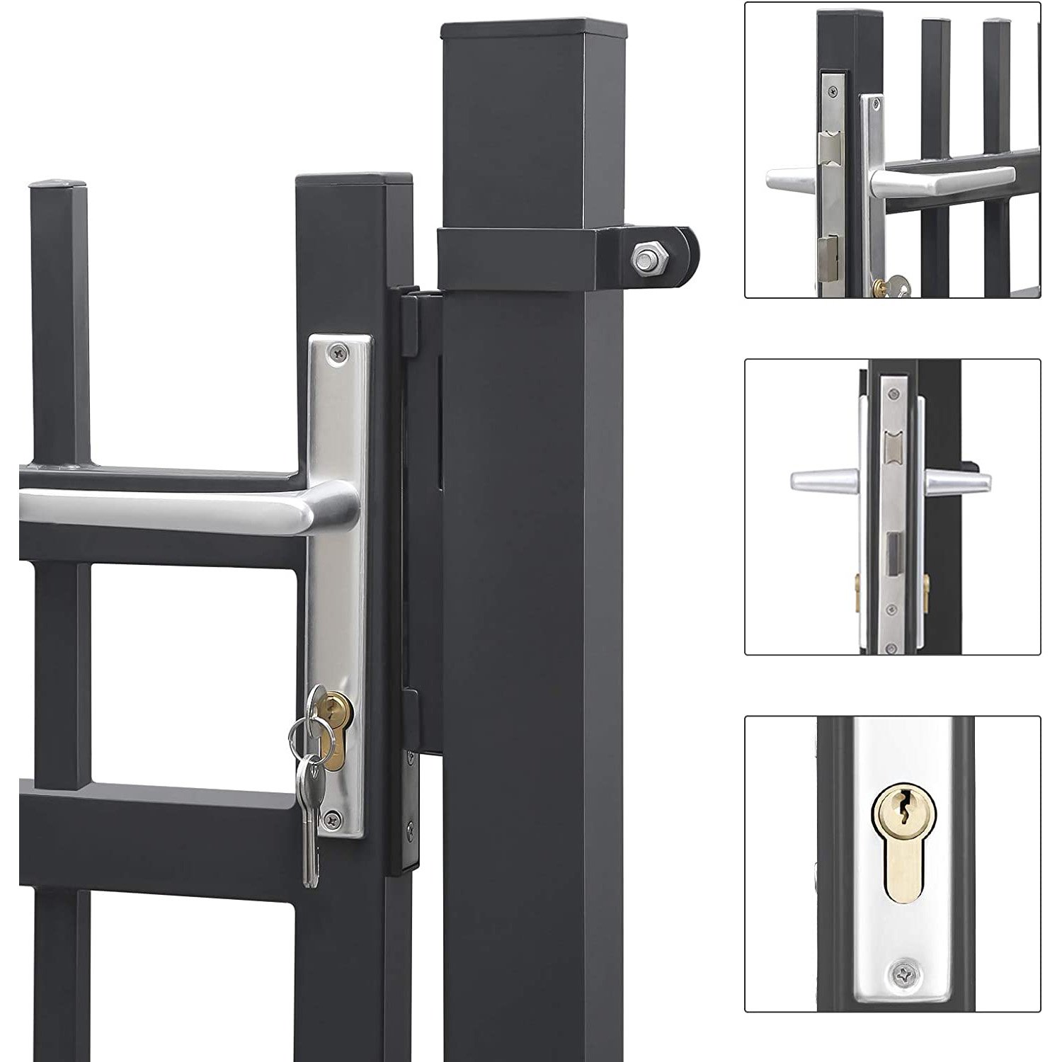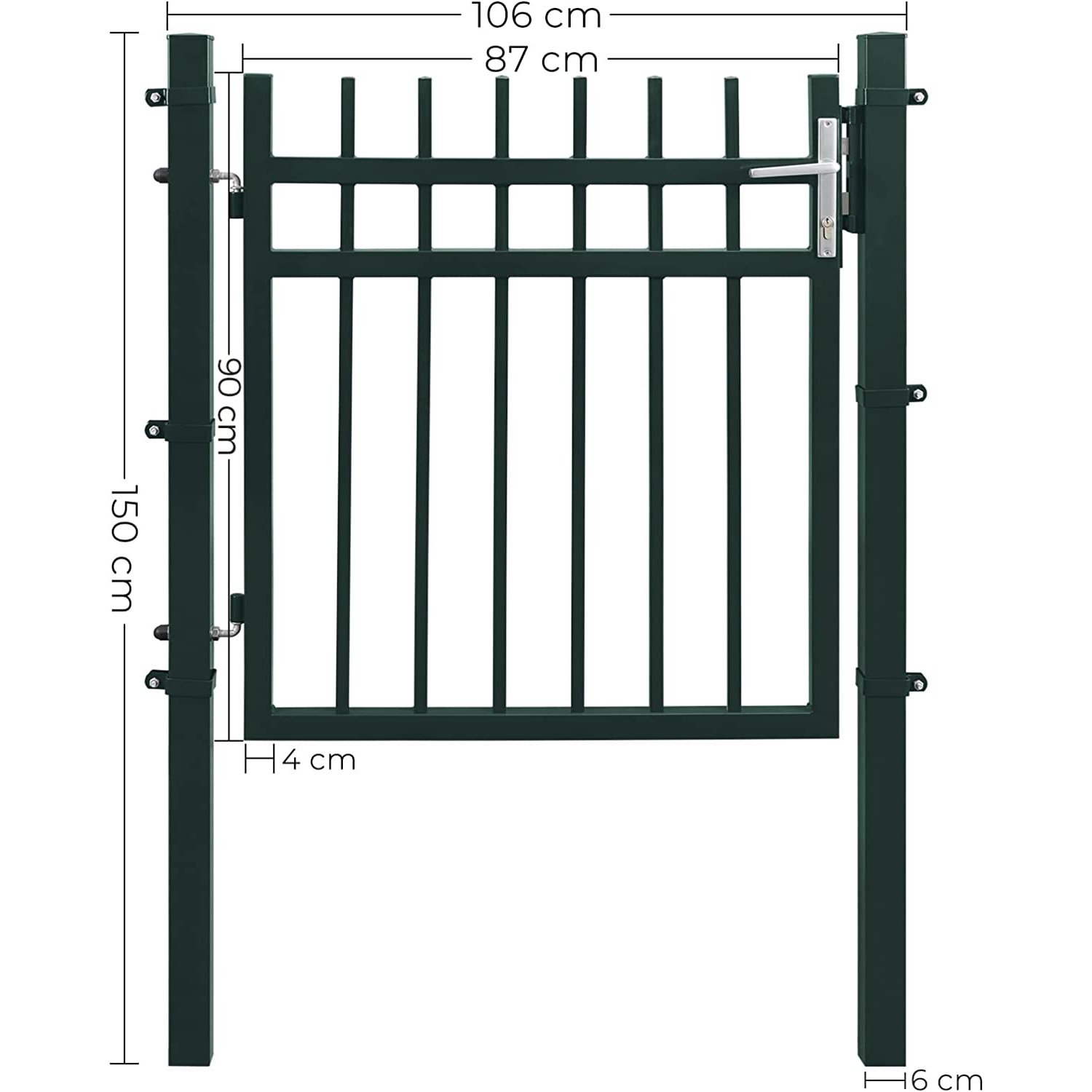 Specifications:- Colour: Grey- Material: Powder-Coated Galvanised Iron, Aluminium Handle, Copper Lock – Product Size: 106 x 150 cm (L x H)- Door Size: 87 x 100 cm (L x H)- Height of Each Post: 150 cm – Product Weight: 21.1 kg Package Contents:Shipped in 2 Packages:Package 1:- 1 x Door- 1 x Bag with Mounting Tools- 1 x Instructions (EN, IT, DE, FR, ES)Package 2:- 2 x Post