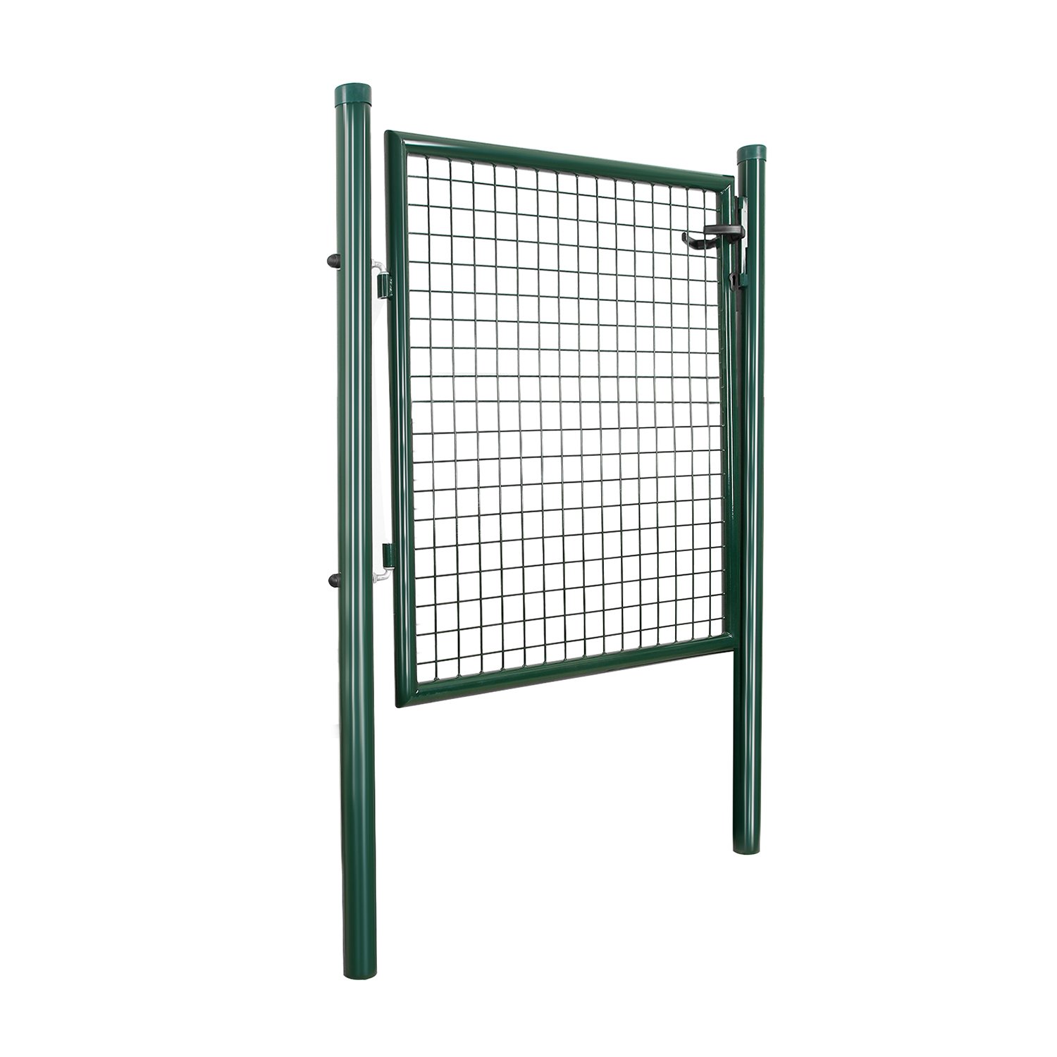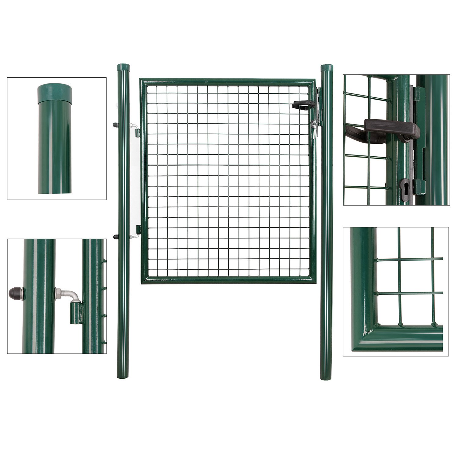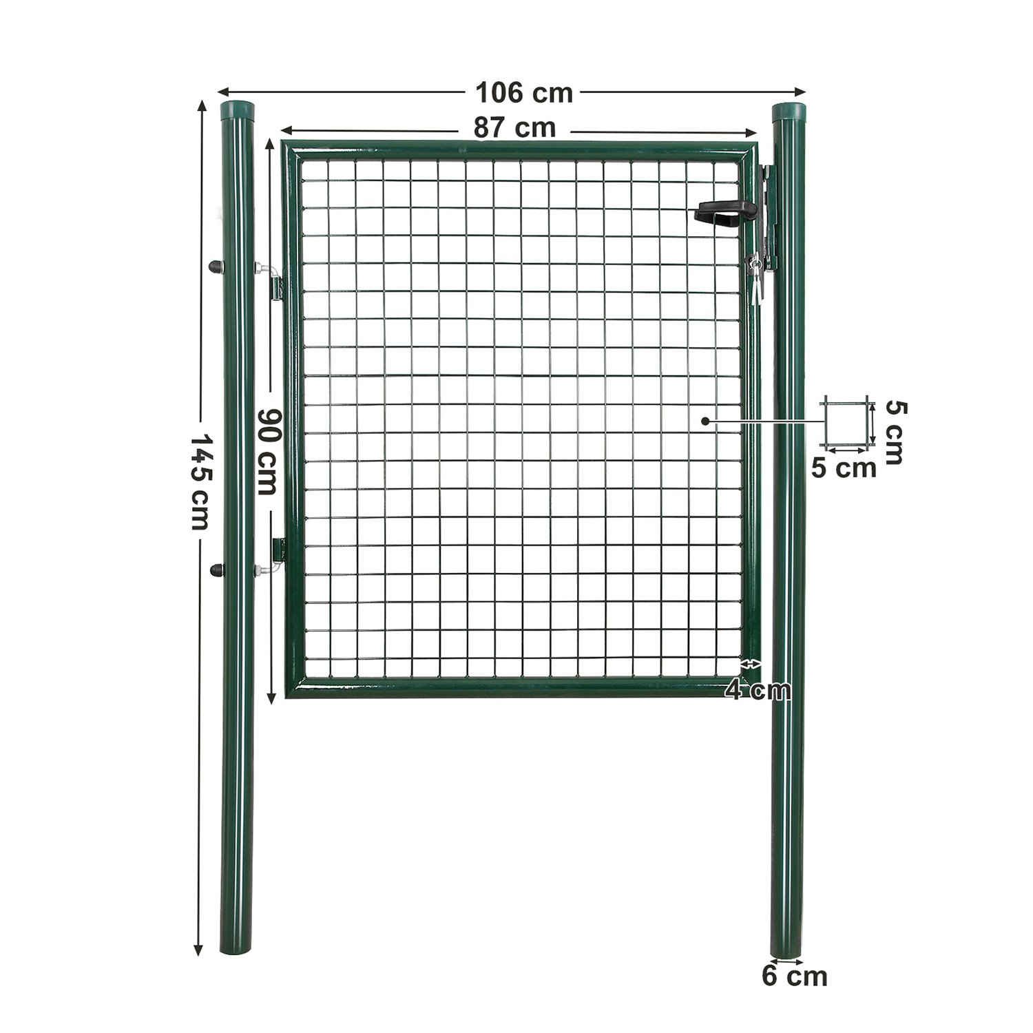 Product details:Material: Galvanised steel tube + galvanised wire mesh + plastic handles + iron key. Colour: Powder coated in RAL 6005 – Green Dimensions: 106 x 150 x 6 cm (W x H x D). Door external dimensions: 100 x 87 cm. Post height: 150 cm. Diameter of posts: 60 mm. Diameter of door frame: 40 mm. Wire thickness: 4 mm. Mesh width: 50 x 50 mm. Weight: 15 kgBox contents: (in two packages)Package 1: 1 x garden gate, 1 x fitting bag, 1 x user manual (DE, EN, FR, IT, ES). Package 2: 2 x door posts