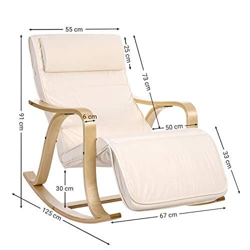 Produktdetaljer: – Färg: Beige – Material: Björkträ, järnram, svampstoppning, bomullsförband – Totala mått: 67 x 125 x 91 cm (LXBXH) – Produktvikt: 10,5 kg – Rygghöjd: 73 cm – Sittdjup: 50 cm – Sittbredd: 55 cm-fotstödslängd: 33 cm- Maximal statisk lastkapacitet: 150 kgförpackning Innehåll:- 1 x gungstol- 1 x påse med monteringsverktyg- 1 x bruksanvisning (IT, det, De, EN, FR, ES)