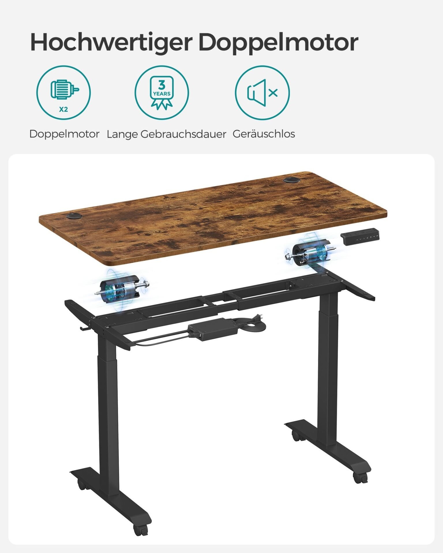 Stable and flexible: thanks to the double support rods and the double motor, the table is stable, up to 120 kg and starts and stops smoothly, the adjustable feet compensate for unevenness and can be replaced with 4 wheels for easy transport