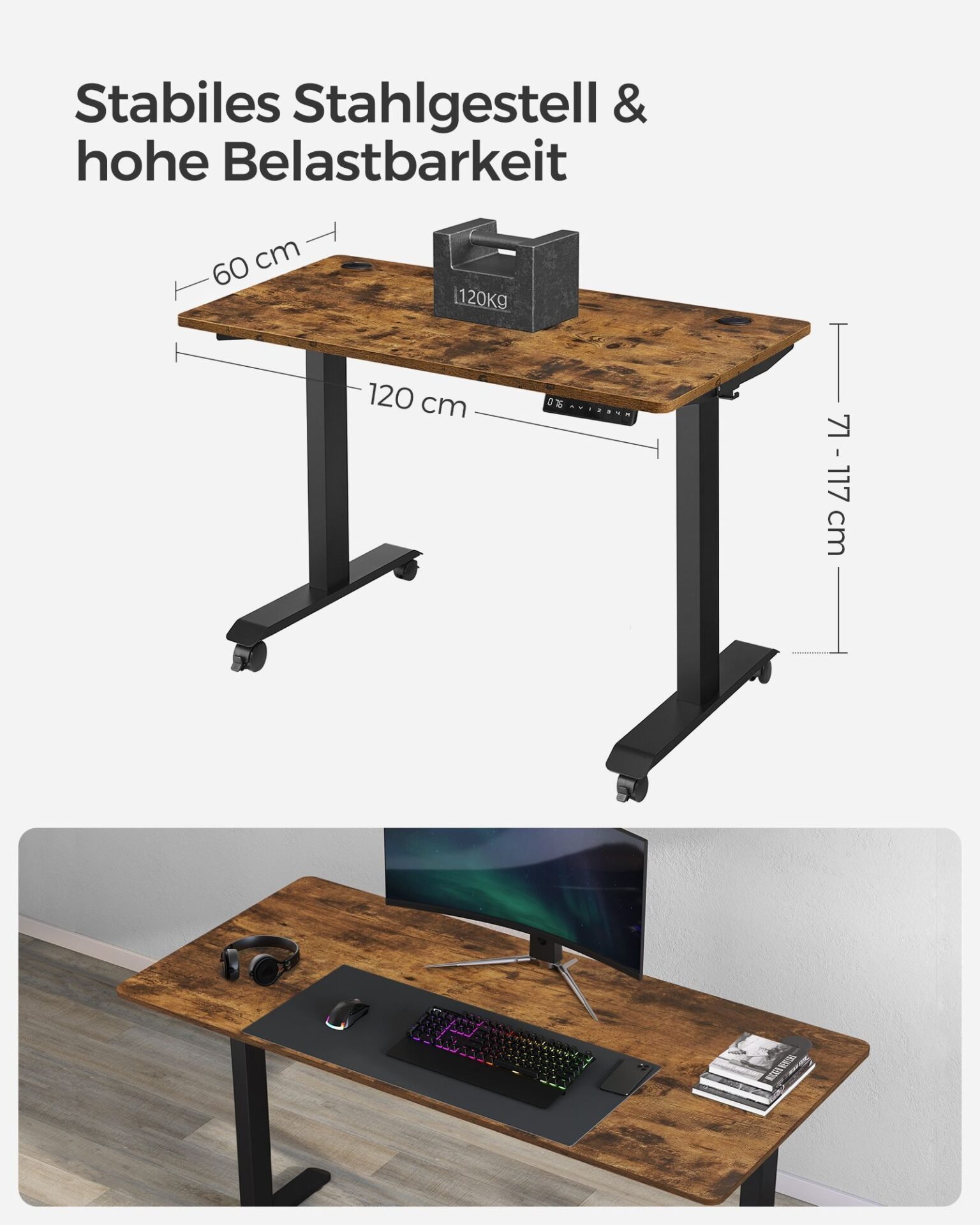 Product Details:Color: vintage brown blackMaterial: chipboard, steelSize: 60 x 120 x (71-117) cm (D x W x H)Height adjustment: 69-115 cmLoudness: