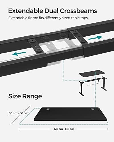 Justerbar tabellram: Den elektriska tabellramen är justerbar i längd mellan 115 och 147 cm, vilket möjliggör flexibel justering till en större bordsskiva (längd: 120 cm -180 cm, bredd: 60 – 80 cm)