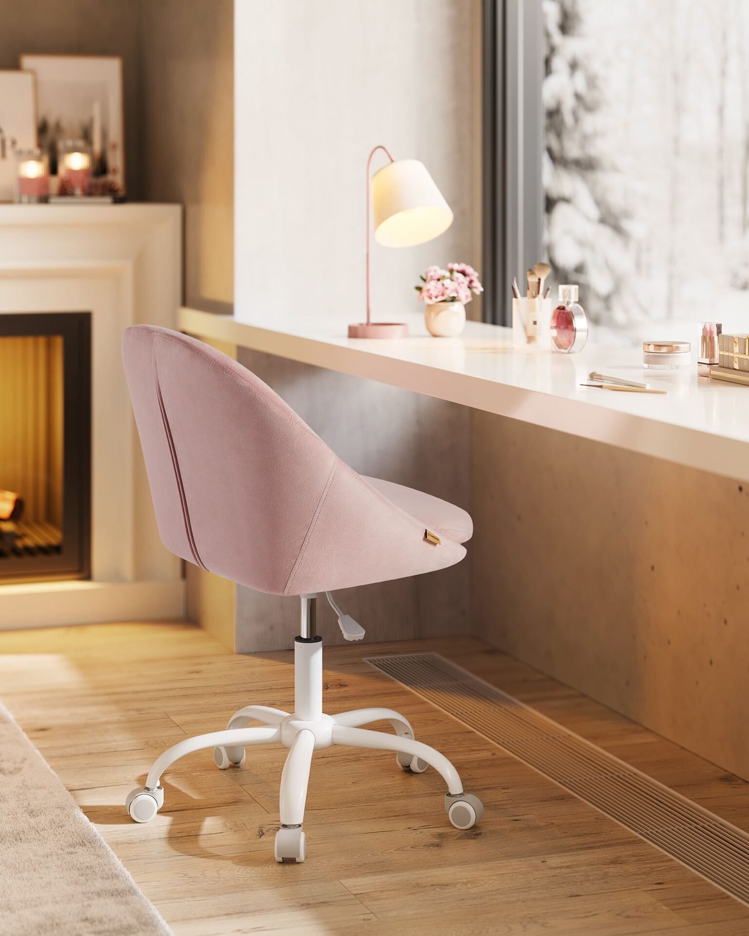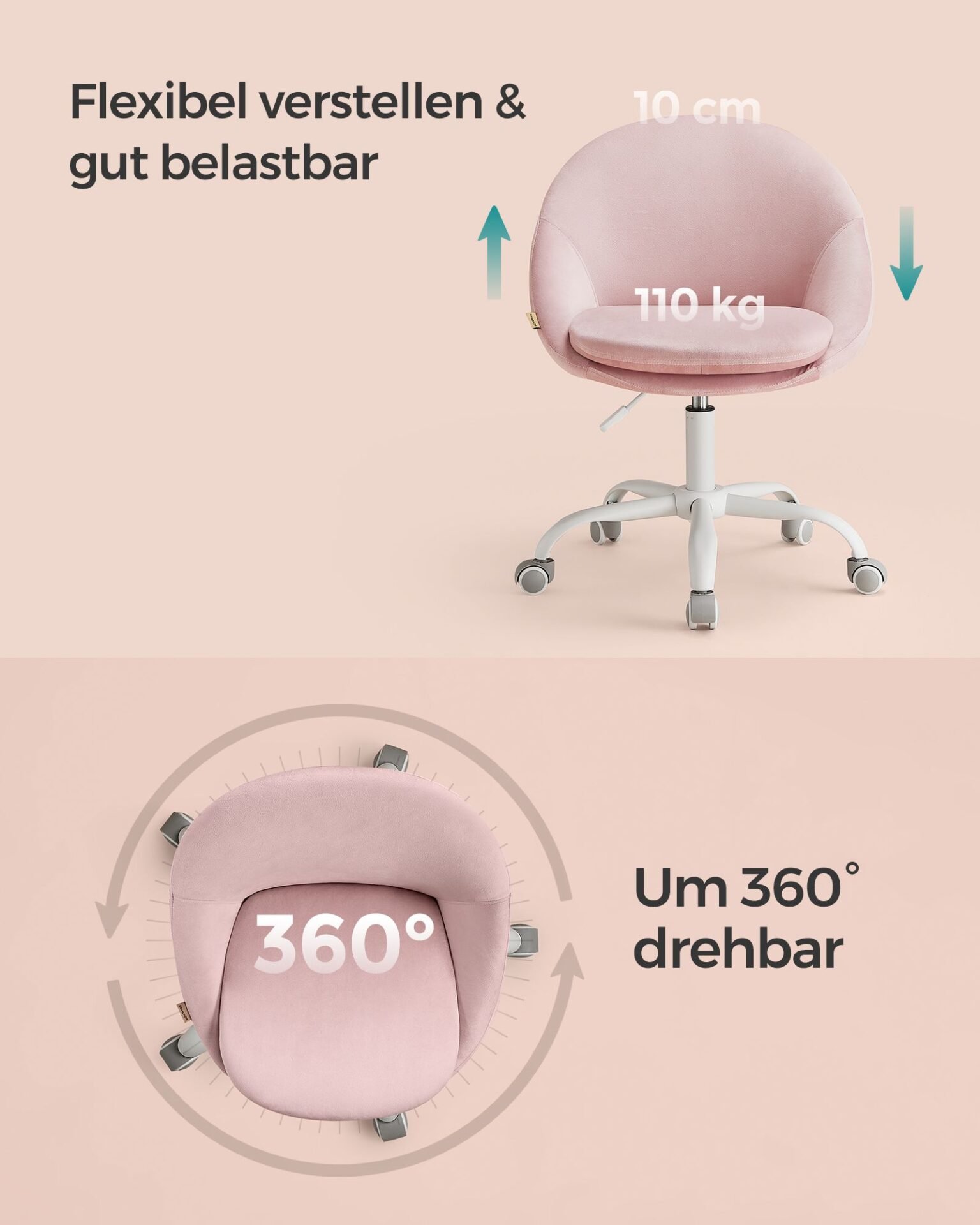 SONGMICS Homeoffice Chair Velvet Swivel Chair Desk Chair Foam Padding Height Adjustable Study Bedroom Pastel Pink OBG020R02