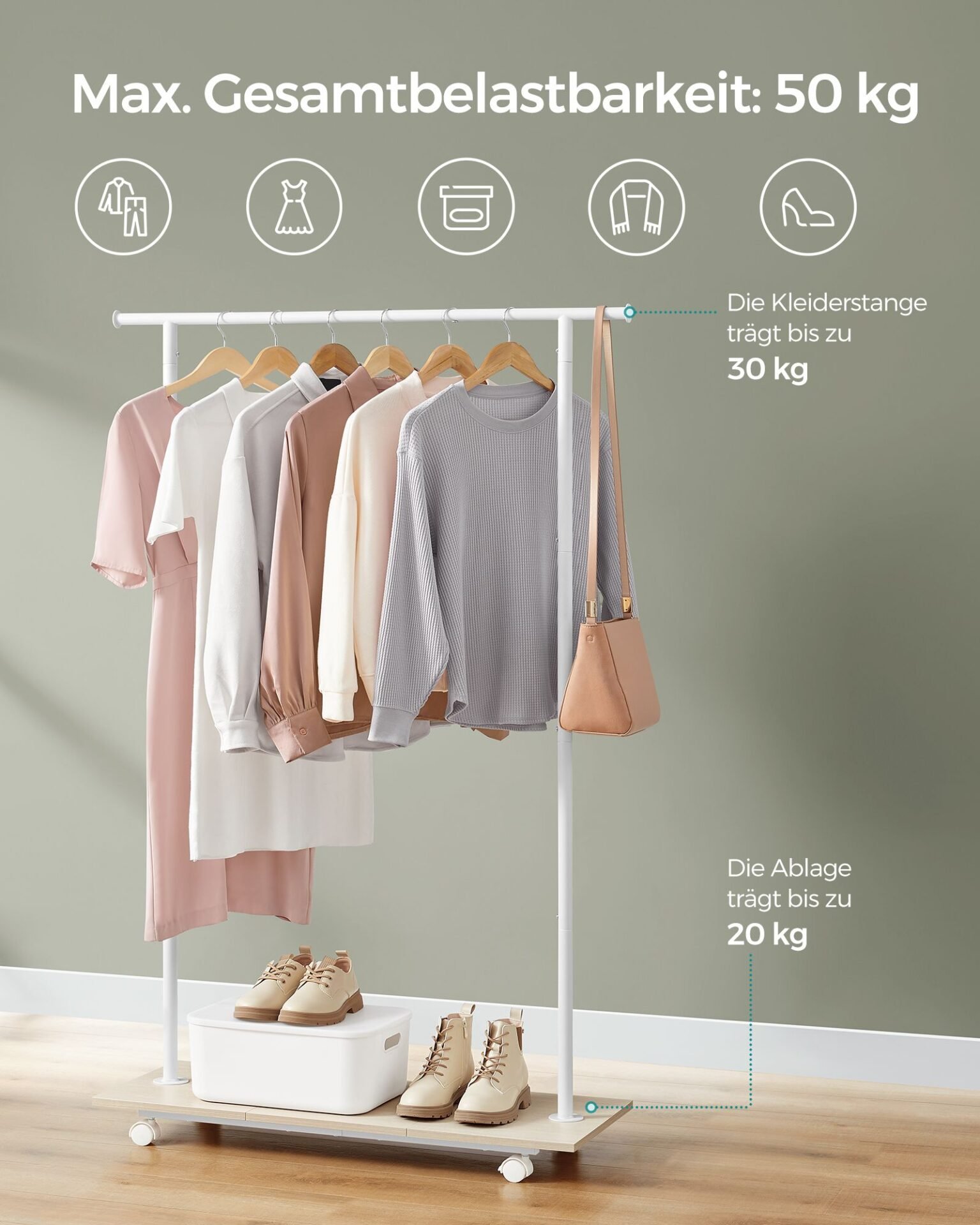 [Spacious and Practical] The 98.5 cm long rod of this clothes rack provides you with enough space to hang jackets, coats, trousers, bags, etc. The bottom shelf provides storage space for shoes and boxes