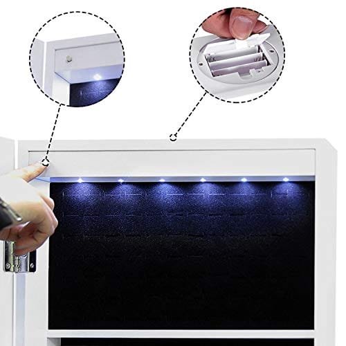 Automatisk LED-belysning: 6 LED-lampor som drivs av 3 AAA/LR03-batterier (ingår ej) på toppen, lyser upp dina tillbehör när du öppnar dörren till det speglade smyckesskåpet, vilket får dina smycken att gnistra och glittra, du behöver inte klä upp dig i mörk