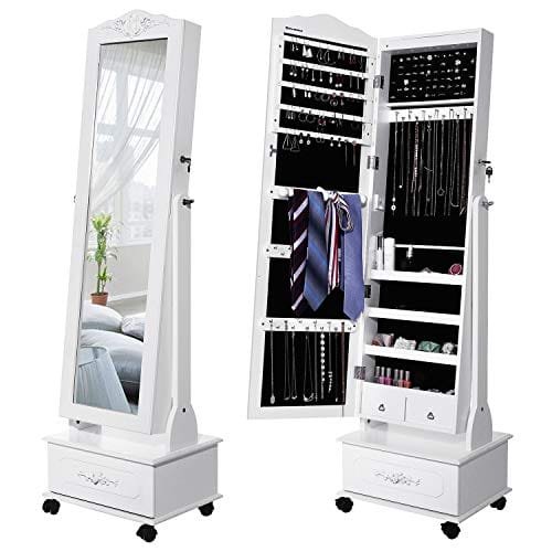 Parametrar:- Färg: Vit Material: Miljövänlig densitet Board- Mått: 45 x 45 x 156 cm (B x DXH)- Storlek på skåpet: 37 x 9,5 x 126 cm (BXDXH)- Storlek på den inre lilla lådan: 15 , 5 x 4 x 4cm (bxdxh)- Storlek på yttre stor låda: 35,5 x 28,5 x 12,5cm (bxdxh)- Spegelstorlek: 27 x 111CM (BXH) Fraktlista:- 1 X Smyckesskåp- 1 x Sockel med låda – 1 x paket med tillbehör – 2 x klockor – 2 x nycklar – Instruktioner (EN, FR, DE, IT, ES)