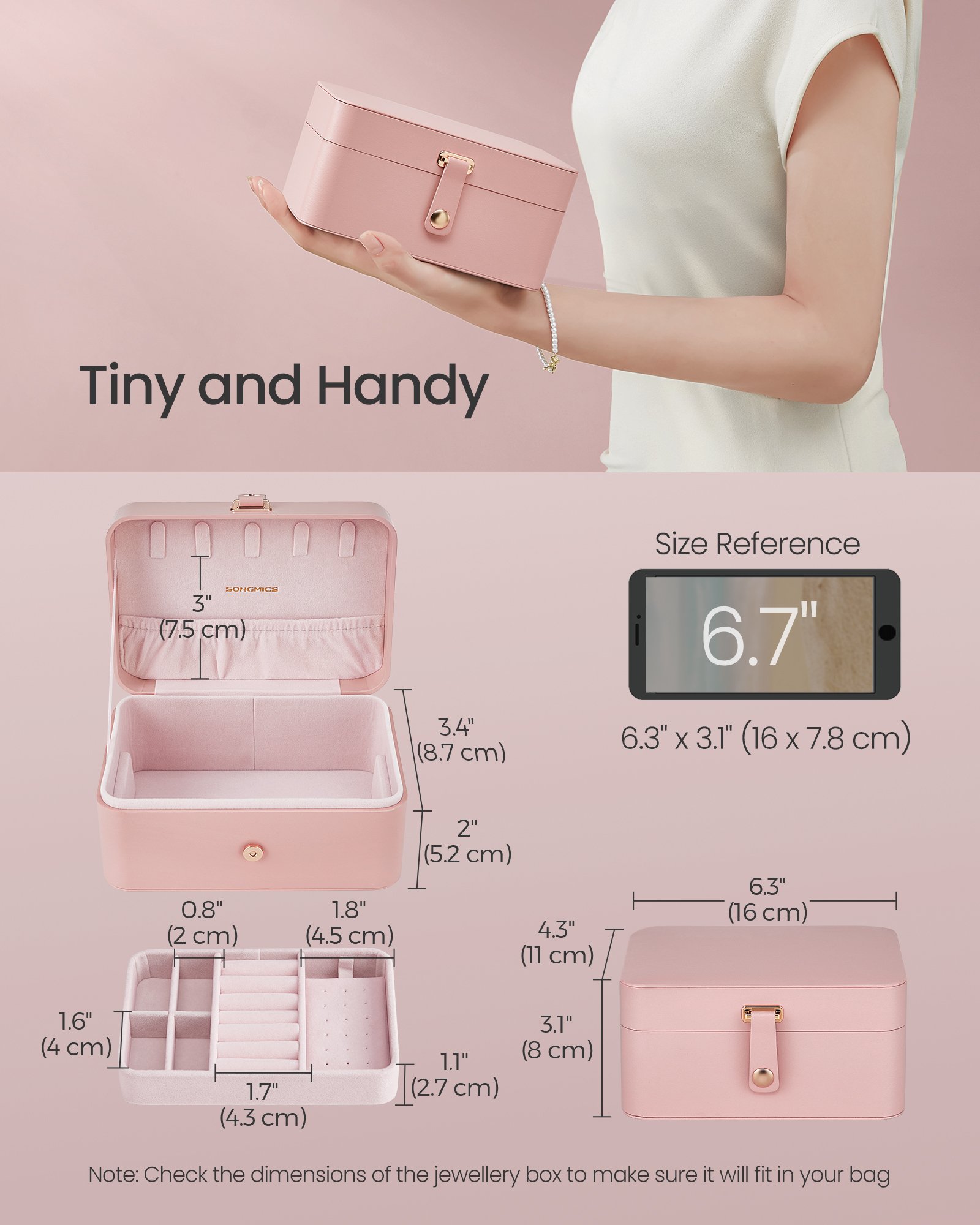 – We recommend checking the exact dimensions of the jewelry box to ensure it fits.