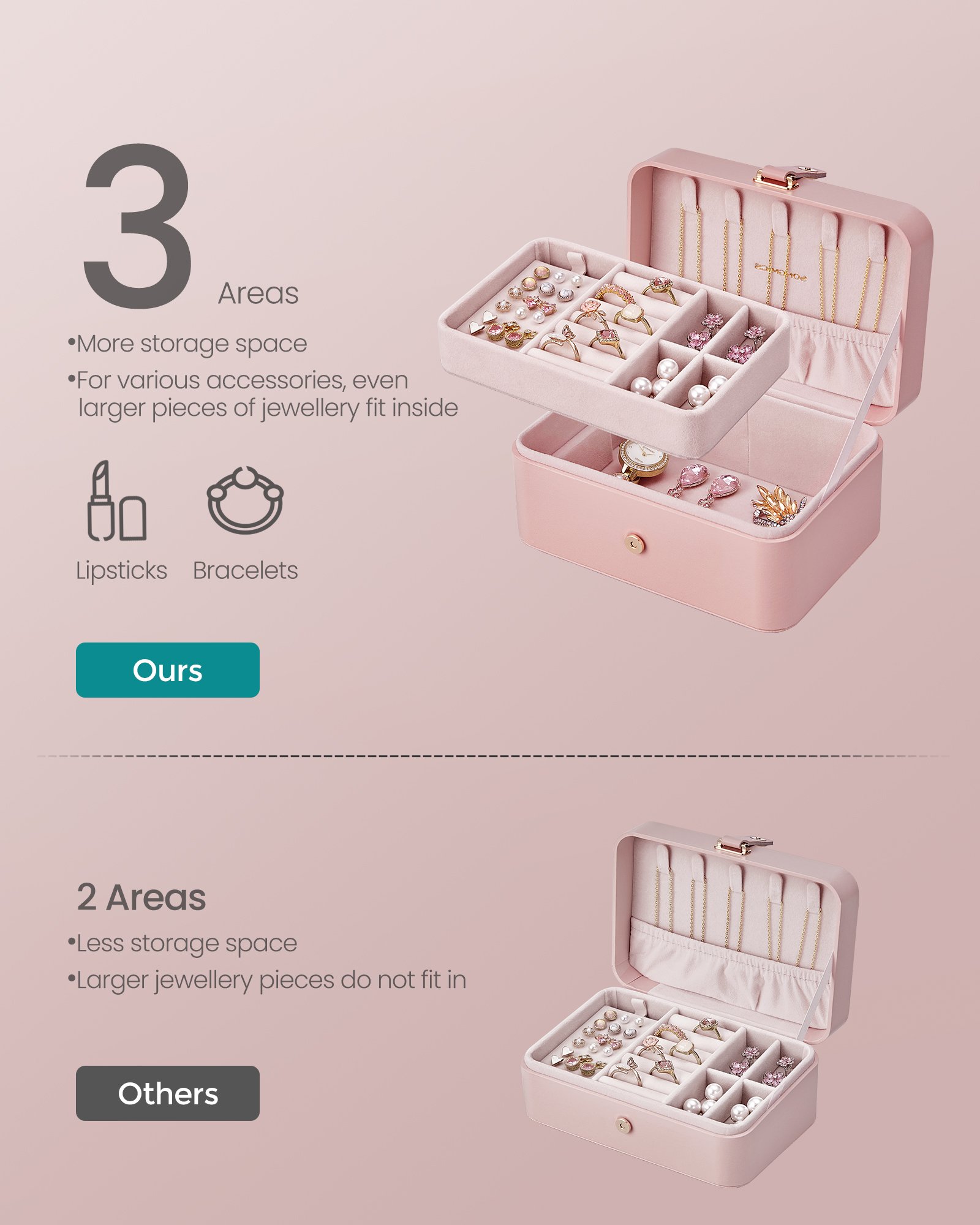 – Stylish Look: The jelly pink color gives the jewelry box an elegant touch.