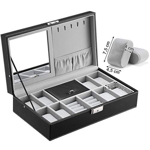 Specifikationer: – Färg: svart (yttre) + grå (inre) – Material: PU + MDF + sammet – Mått: ca. 33,3 x 19,3 x 9,5 cm (L x B x H) – Kuddstorlek: 4,5 x 7,5 x 4 cm – Gallerstorlek: 9 x 4,5 cm – Netto: 1,44 kg förpackningsinnehåll: – 1 x smyckeskrin (inkluderar ej smycken) – 2 x nycklar