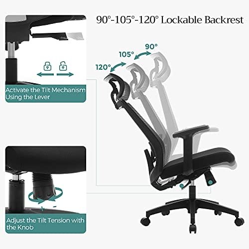 STEGPÖRT JUSTERBAR RYGGSTÖD: Justera ryggstödets vinkel mellan 90° och 120°. Lås i den vinkel du föredrar och luta dig tillbaka med tillfredsställelse. Tack vare det flexibla ryggstödet kan du enkelt växla mellan arbetsläge och avslappningsfaser