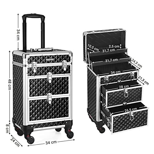 Specifikationer:- Färg: Svartmaterial: Aluminiumram, MDF-kort, ABS-plastproduktstorlek: 34 x 24 x 57 cm (l x w x h)- Produktvikt: 6 kg-max. Load Cacity: 50 KgPackage Innehåll:- 1 x Portabelt vagnskosmetiskt fodral