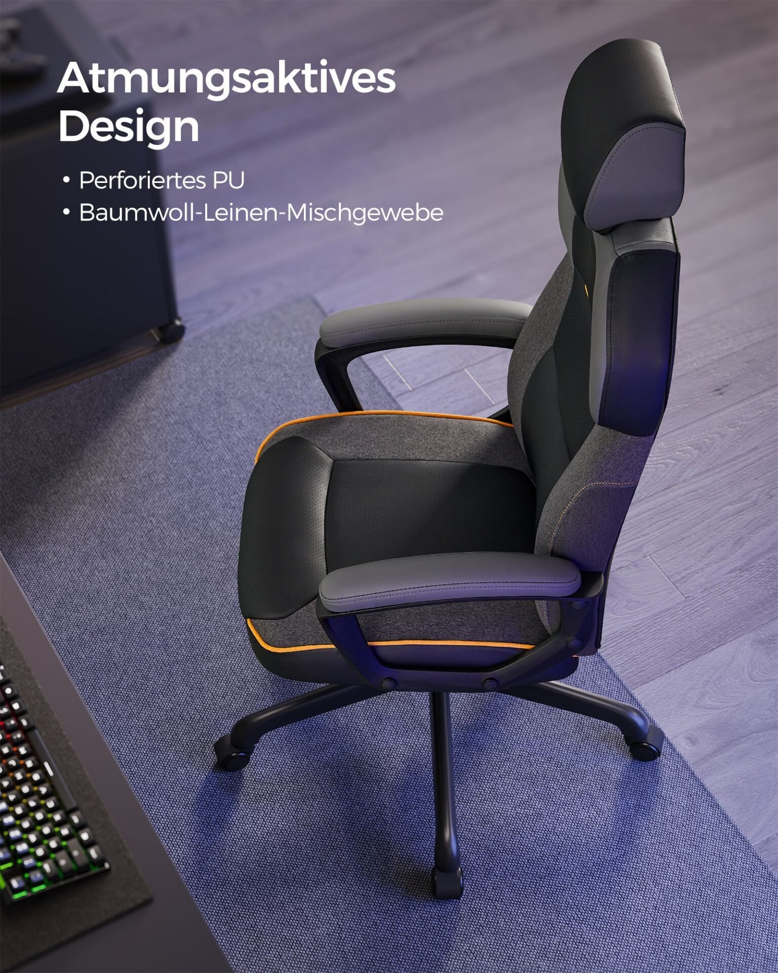Breathable surface: Thanks to perforated PU and cotton linen blend, your body can ”breathe” even when sitting for a long time. With this office chair, you can say goodbye to ”sticking” in summer