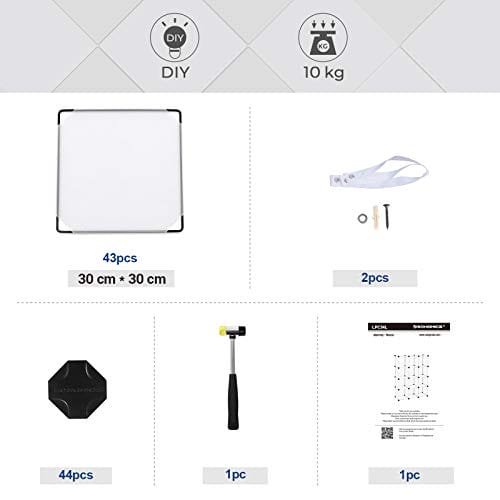 Specifikationer: Färg: Transparent vit Material: PP-plastskivor med metalltrådsram, ABS-plastplugg Produktstorlek: 93 x 31 x 123 cm (LXBXH) Vikt: 6,5 kgmax. Lastkapacitet för varje kub: 10 kg förpackning Innehåll: 43 x Transparent vit plastplatta (30 x 30 cm) 44 x Svart ABS plastplugg 1 x Gummiklubba 2 x Anti-tappningsmontering 1 x Instruktioner (da, de, fr, es, Det)