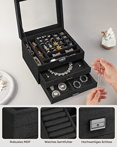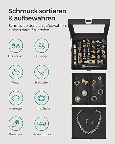 Vad du får: Ett svart smyckeskrin som mäter 23,2 x 20,5 x 14 cm, ett glaslock för en snabb glimt av insidan, ett lås med nyckel och olika förvaringsfack även för klockor, manschettknappar med mera