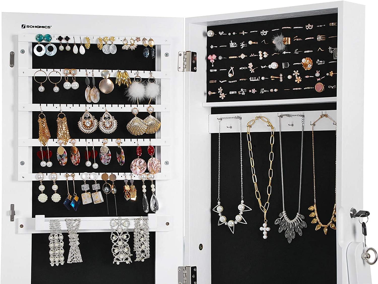 Örhängen, halsband, ringar: nu är det dags att kombinera smycken med din nya outfit. Det finns gott om plats i denna smyckeskrinspegel – 120 örhängen, 78 för ringar, 24 krokar för halsband och 4 hyllor för andra tillbehör