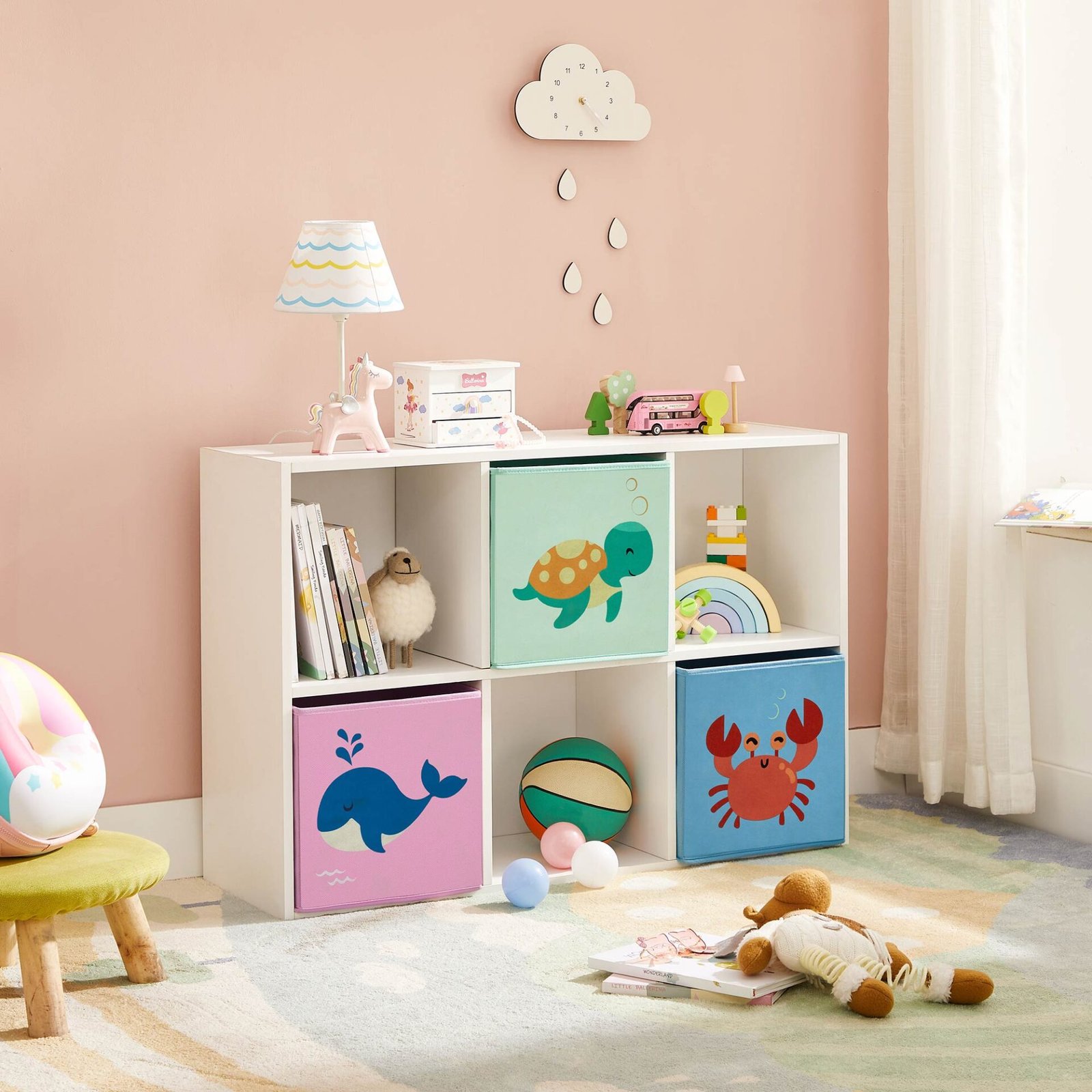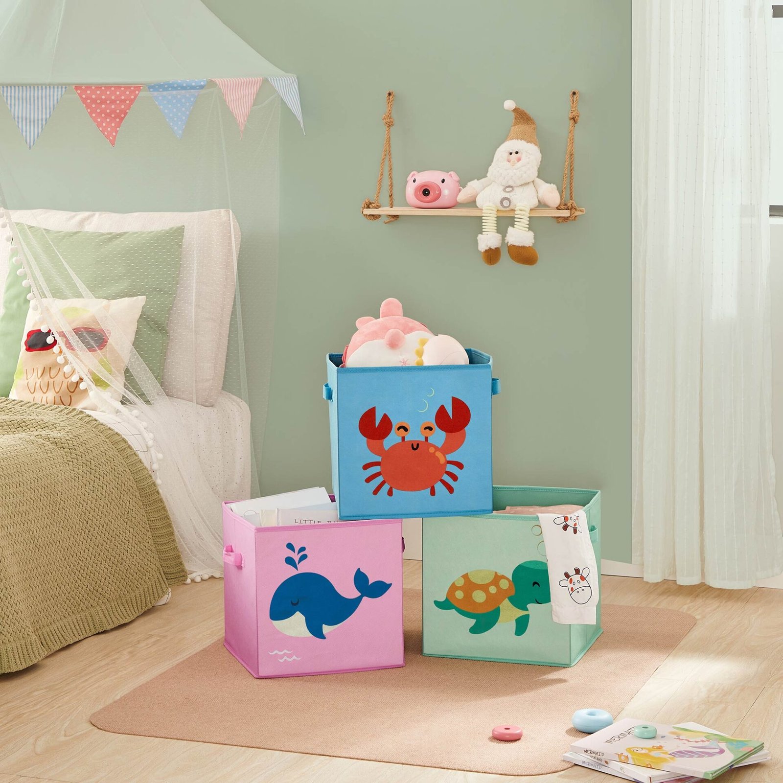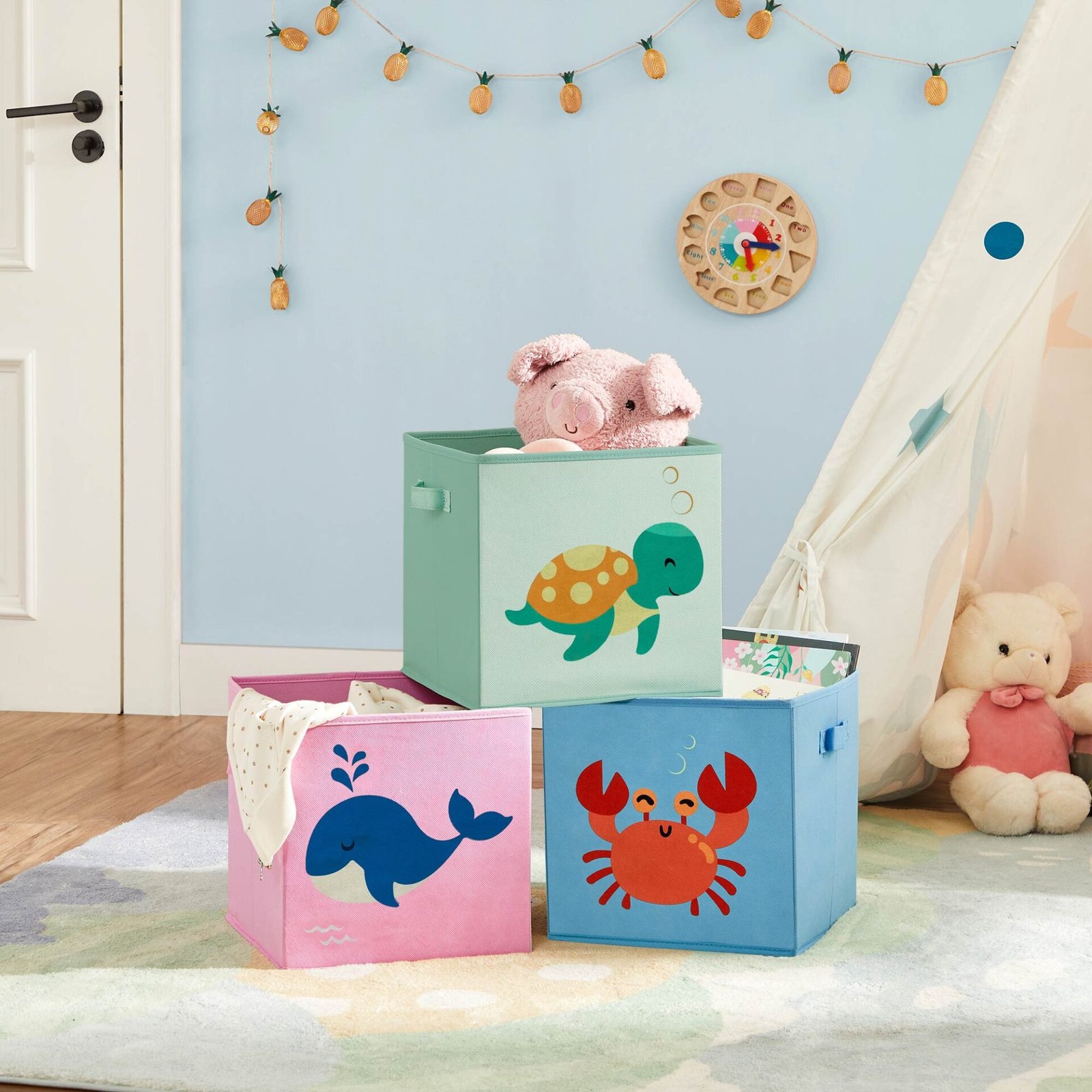 Explore the Ocean World: The adorable whale, turtle, and crab on the pink, green, and blue storage boxes are calling you and your child to come and explore the fun ocean world!