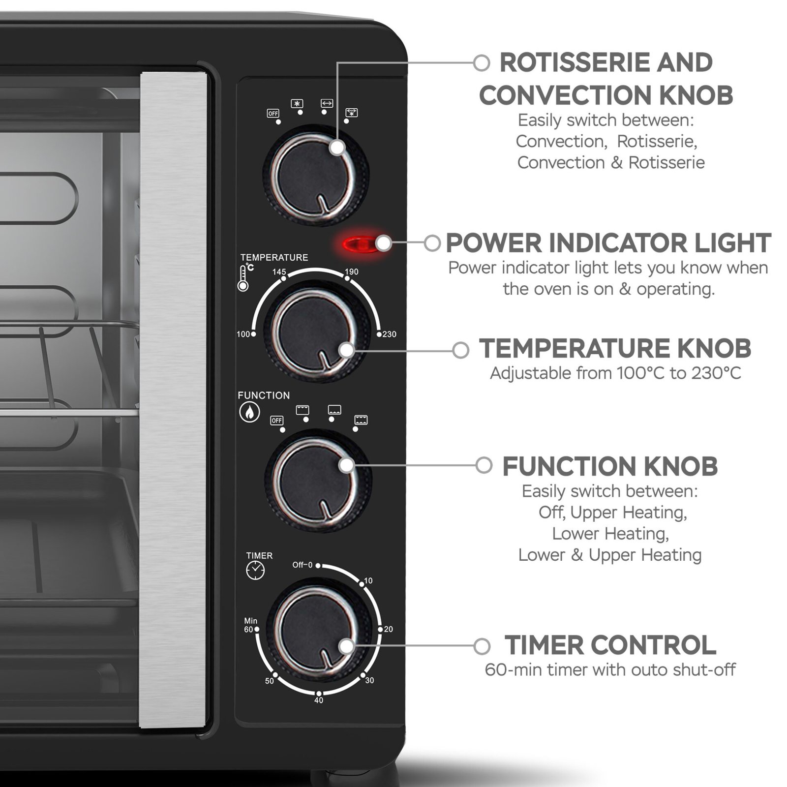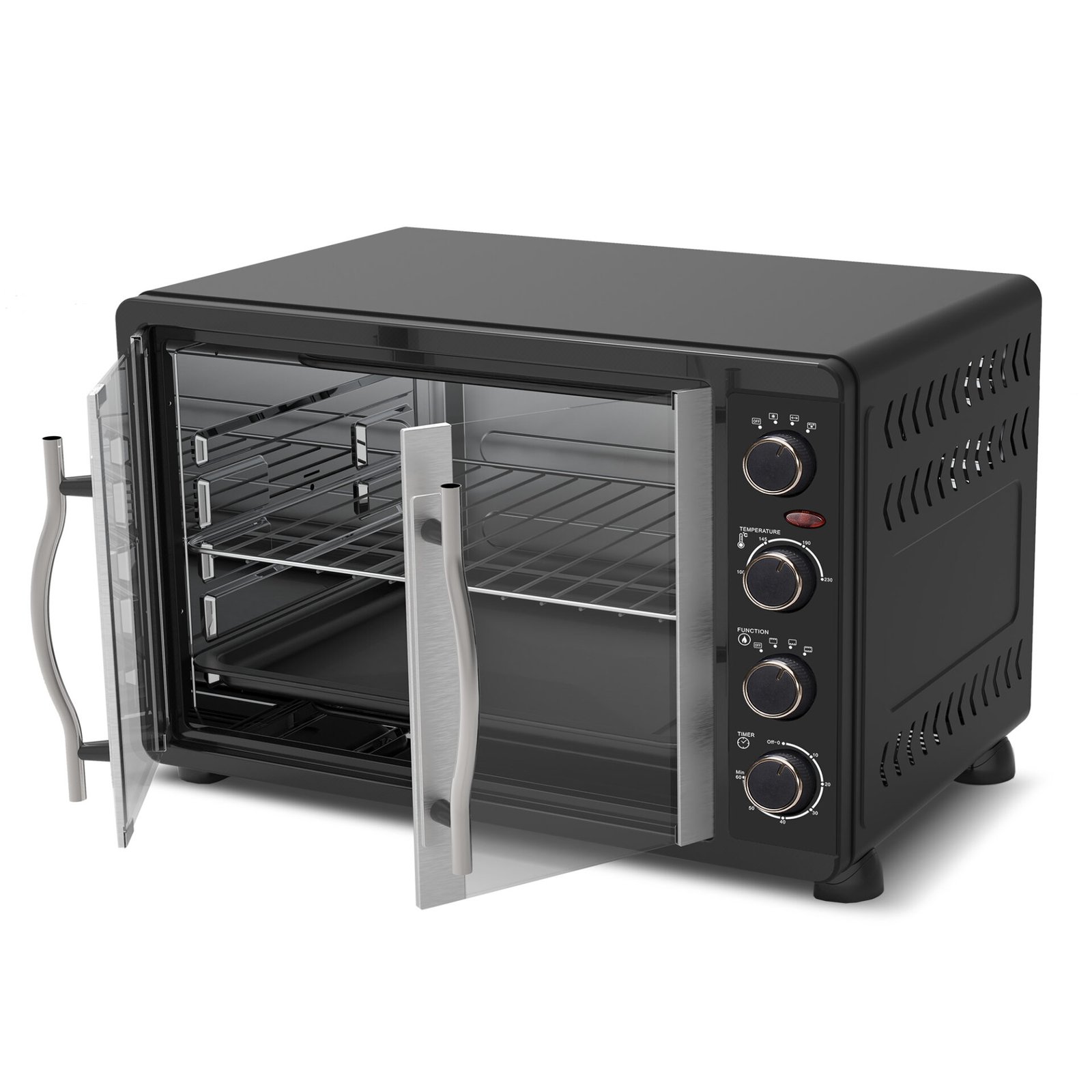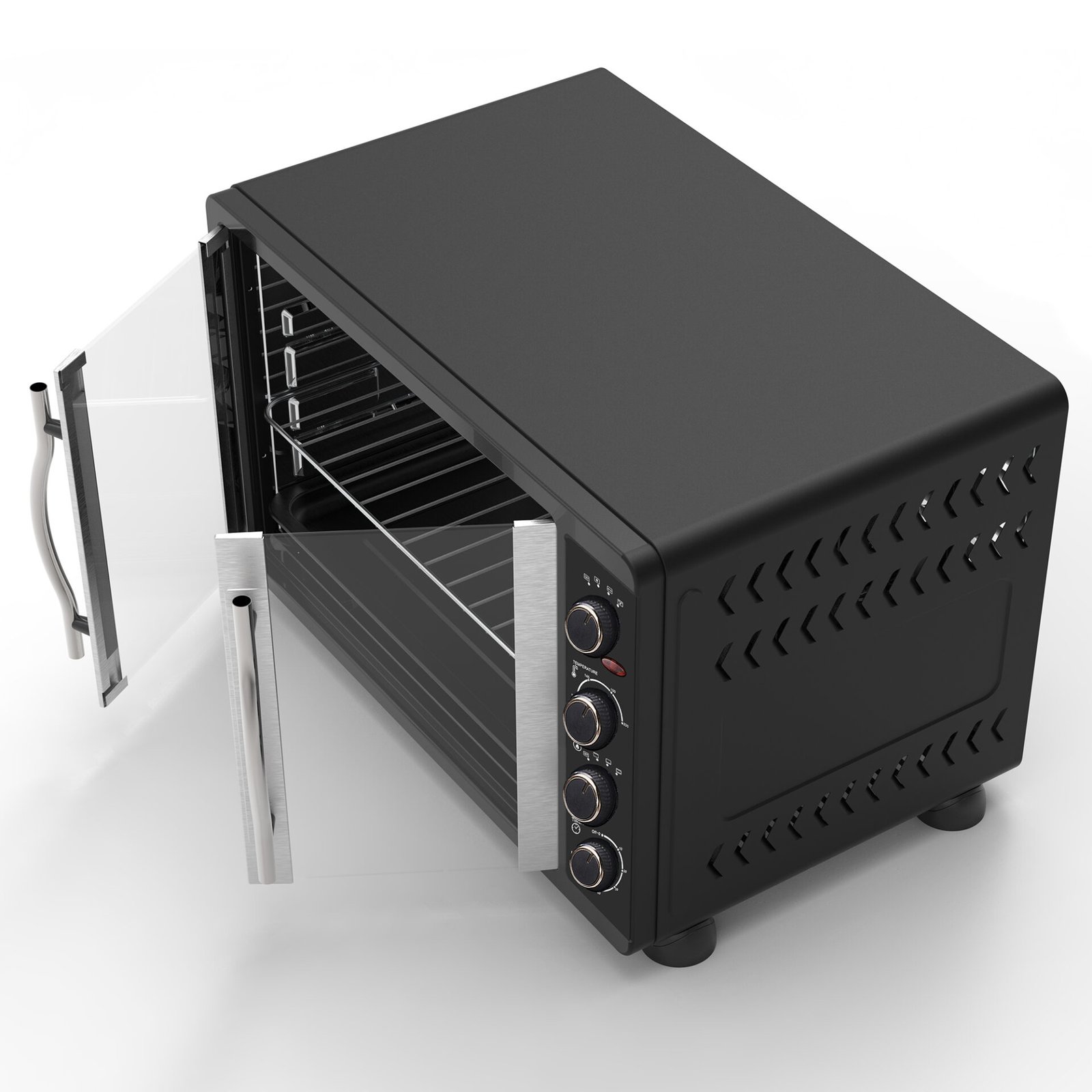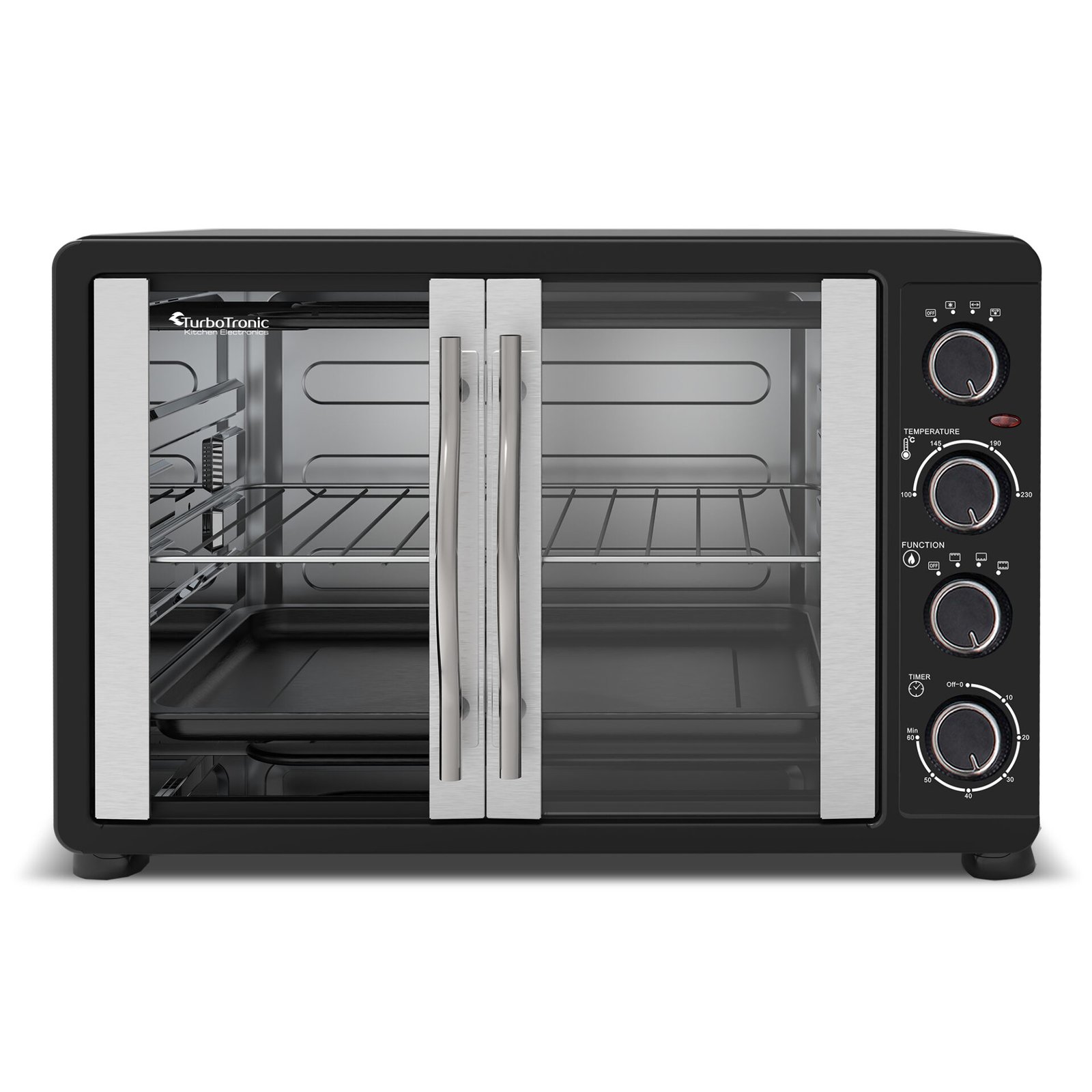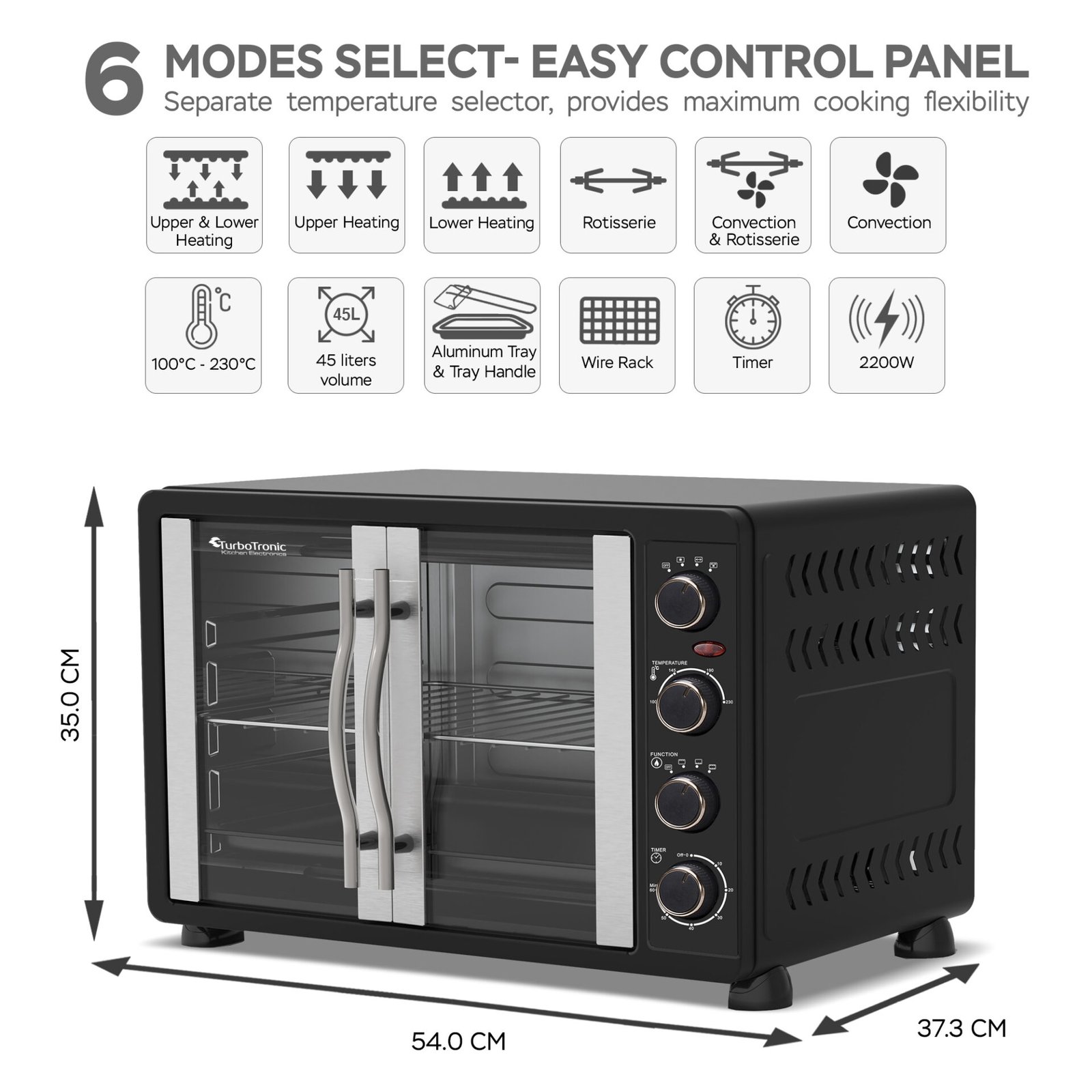 De TurboTronic FEO45 elektriska ugn från TurboWave-serien är den fristående ugnen som enkelt kan placeras på köksbänken och som inte står tillbaka för inbyggnadsugnar. Ugnens prestanda är perfekt när det gäller bakning, uppvärmning eller grillning. Med en volym på 45 liter är ugnen också idealisk för en stor familj. Det som gör ugnen unik är det franska dörrdesignen, som är mycket energisparande eftersom värmeförlust förhindras. Genom de öppningsbara dörrarna av genomskinligt glas och ugnsbelysningen kan du noggrant följa bakprocessen för dina måltider. När du inte har lust eller tid att följa tillagningen av din rätt, har ugnen en timer som du kan ställa in. När bakningen är klar hör du ett ljudsignalt. Temperaturen på FEO45 kan ställas in mellan 100 och 230 grader Celsius. Dessutom ingår följande tillbehör: en bakplåt med non-stick-beläggning, ett galler, ett roterande spett och ett praktiskt tray-handtag. Med handtaget kan du utan ugnsvantar ta bort bakplåten, det roterande spettet eller gallret när din måltid är klar. Oavsett vilken ugnsrätt du serverar, kan allt göras med FEO45-ugnen! Unika egenskaper hos TurboTronic FEO45 elektriska ugn ✔ Franska dörrarEn av de unika egenskaperna hos denna elektriska ugn är det franska dörrdesignen. De öppningsbara dörrarna är energisparande eftersom värmeförlusten begränsas vid öppning av dörrarna. Bakprocessen kan du följa noggrant genom de franska dörrarna av genomskinligt glas. ✔ Topprestanda När det gäller bakning, grillning eller uppvärmning levererar FEO45-ugnen toppresultat. Denna ugn kan ställas in på temperaturer mellan 100 och 230 grader Celsius. Tack vare den höga effekten på 2000 Watt fungerar den utmärkt och står sig väl jämfört med inbyggnadsugnar. ✔ Medföljande tillbehörFör att optimera användningen av denna ugn får du med ett bakplåt med non-stick-beläggning, ett galler, ett roterande spett och ett praktiskt tray-handtag. Med handtaget kan du ta bort bakplåten, det roterande spettet eller gallret utan att bränna dig och utan att behöva använda ugnsvantar. ✔ Kompakt design, stor volymDen fristående ugnen tar liten plats tack vare sin kompakta storlek. Därför kan du enkelt placera den på köksbänken utan att offra mycket av din arbetsyta. Men låt dig inte luras av dess kompakta utseende. Utrustad med en rymlig volym på 45 liter, kan du enkelt laga stora ugnsformar. ✔ Mångsidig och praktisk Ugnens är mycket mångsidig. Du kan baka, grilla eller helt enkelt värma upp. Förutom de praktiska franska dörrarna är ugnen utrustad med inbyggd belysning. Dessutom styrs ugnen med hjälp av 4 vridknappar, som bland annat låter dig ställa in temperatur och timer. Specifikationer Prestanda Volym: 45 literEffekt: 2000 Watt220-240 VTimer: upp till 60 minuterTemperatur: 100 – 230 grader CelsiusTillagningar: grillning, bakning och uppvärmningAlternativ: konvektion, rotering, undervärme och/eller övervärme Design Färg: svartModern designFranska dörrar av genomskinligt glasHandtag och dörrkarmar av rostfritt stålKontroll: 4 vridknapparTillbehör: tray-handtag, galler, roterande spett, bakplåt Mått och vikt Produktmått (l x b x h): 54 x 37,3 x 35 cmFörpackningsmått (l x b x h): 59,8 x 44,1 x 42,7 cm Produktvikt: 8,2 kg TURBOTRONICTurboTronic har tillverkat prisvärda hushållsapparater sedan 1992. Sortimentet består av högkvalitativa, trendiga och moderna produkter. Produkterna är också hållbara, både vad gäller högkvalitativa maskindelar och det funktionella designen som gör det lätt att använda TurboTronic-produkter dagligen. Alla produkter har kontrollerats enligt de högsta europeiska standardkraven. Vi står bakom varje produkt vi säljer och testar varje apparat noggrant och individuellt, vilket vår tvååriga garanti bevisar. Vårt varumärke TurboTronic kombinerar en inre och tidlös elegans med en unik intuitiv kontroll.