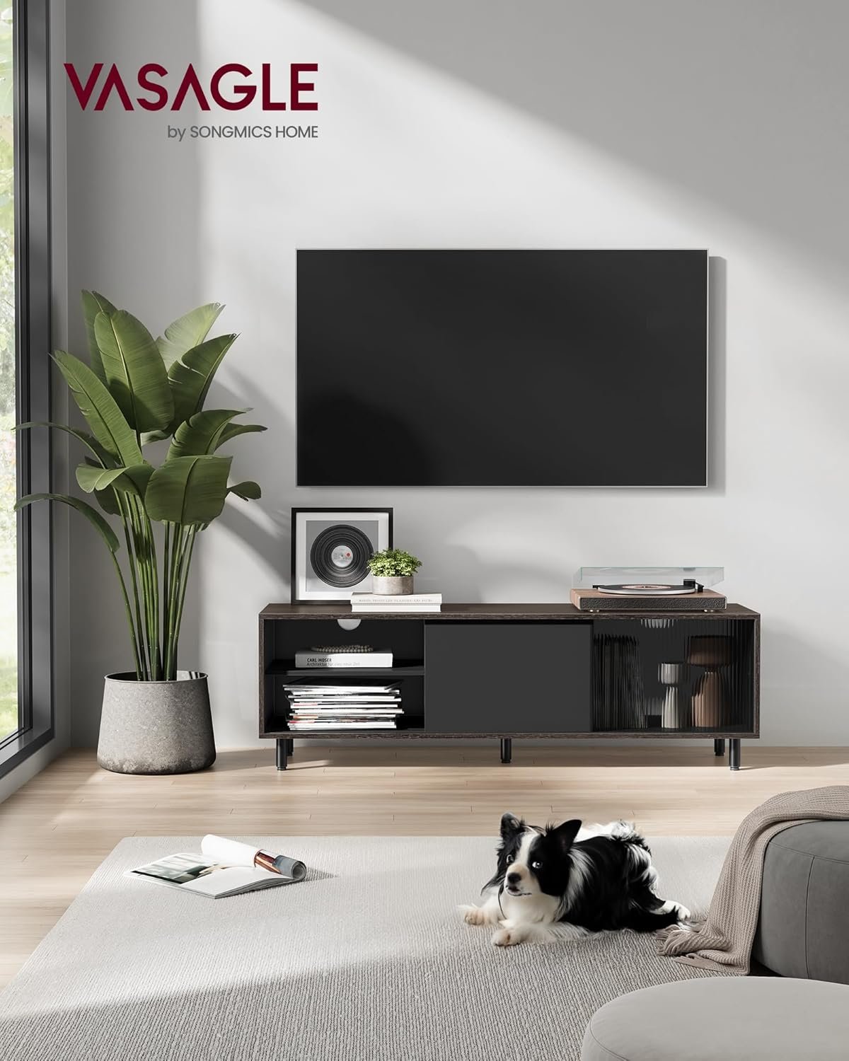 【INBJUDAR TILL MODERN LIV】Modern stil möter avslappnat boende med denna TV-möbel. De två tonerna askbrunt och bläcksvart introducerar en elegant, modern känsla, medan det räfflade glaset utstrålar en mjuk, disig atmosfär och skapar ett inbjudande underhållningsutrymme.