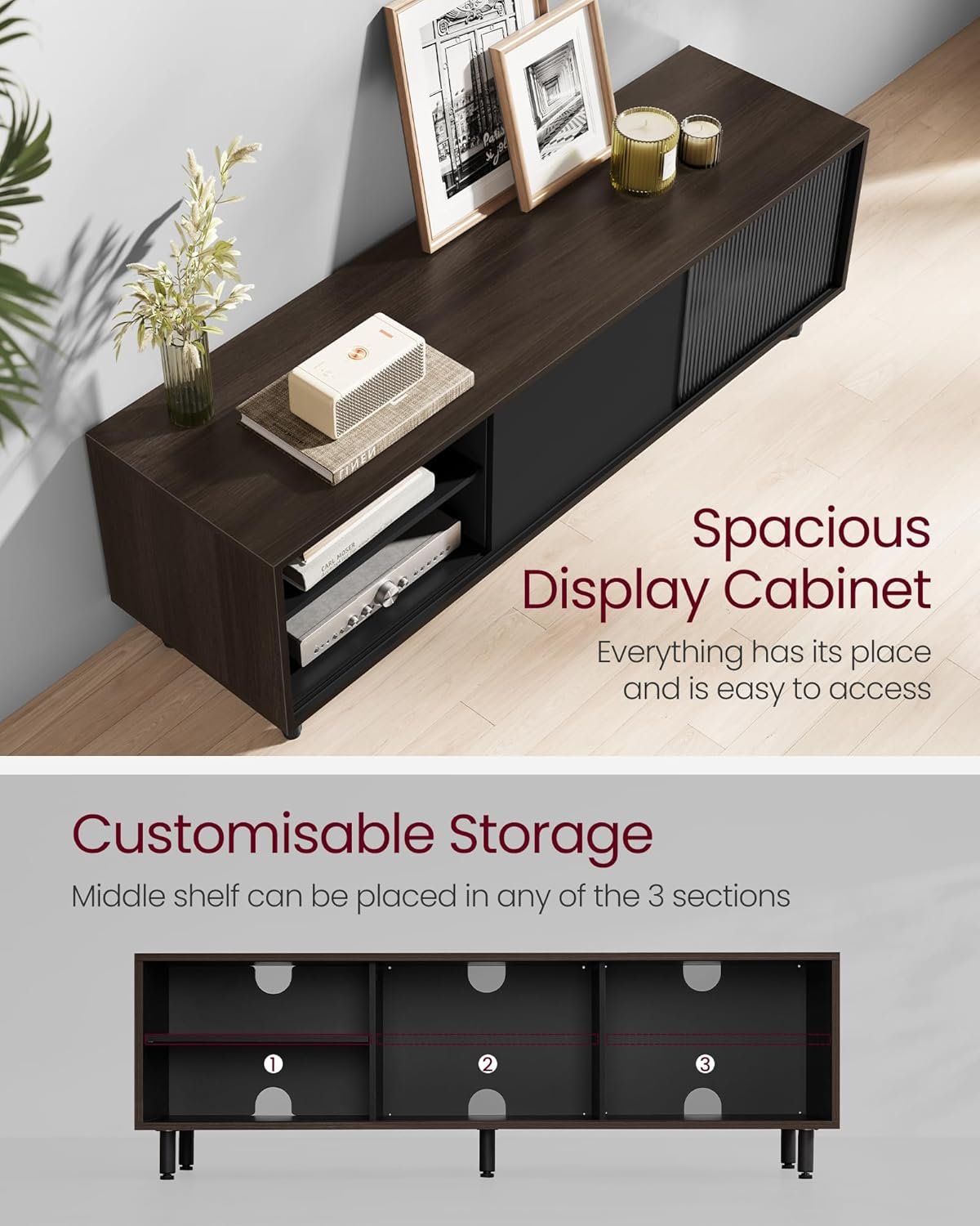 RYMLIG OCH JUSTERBAR】Skjutdörrarna låter dig visa eller dölja viktiga mediaföremål efter önskemål, medan det räfflade glaset ger undanskymd förvaring för estetik och avskildhet. Mitthyllan kan placeras i vilken som helst av de 3 sektionerna enligt dina önskemål