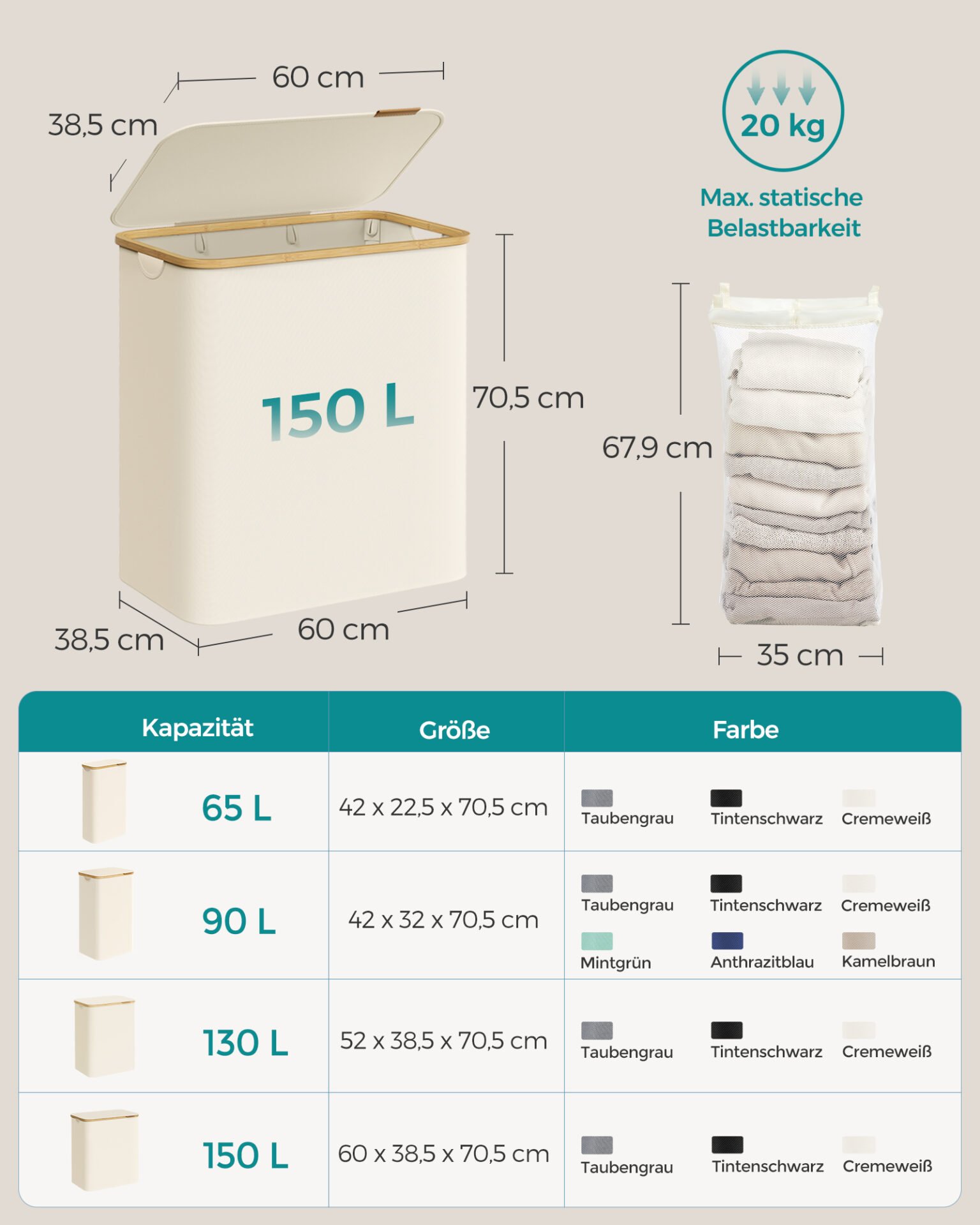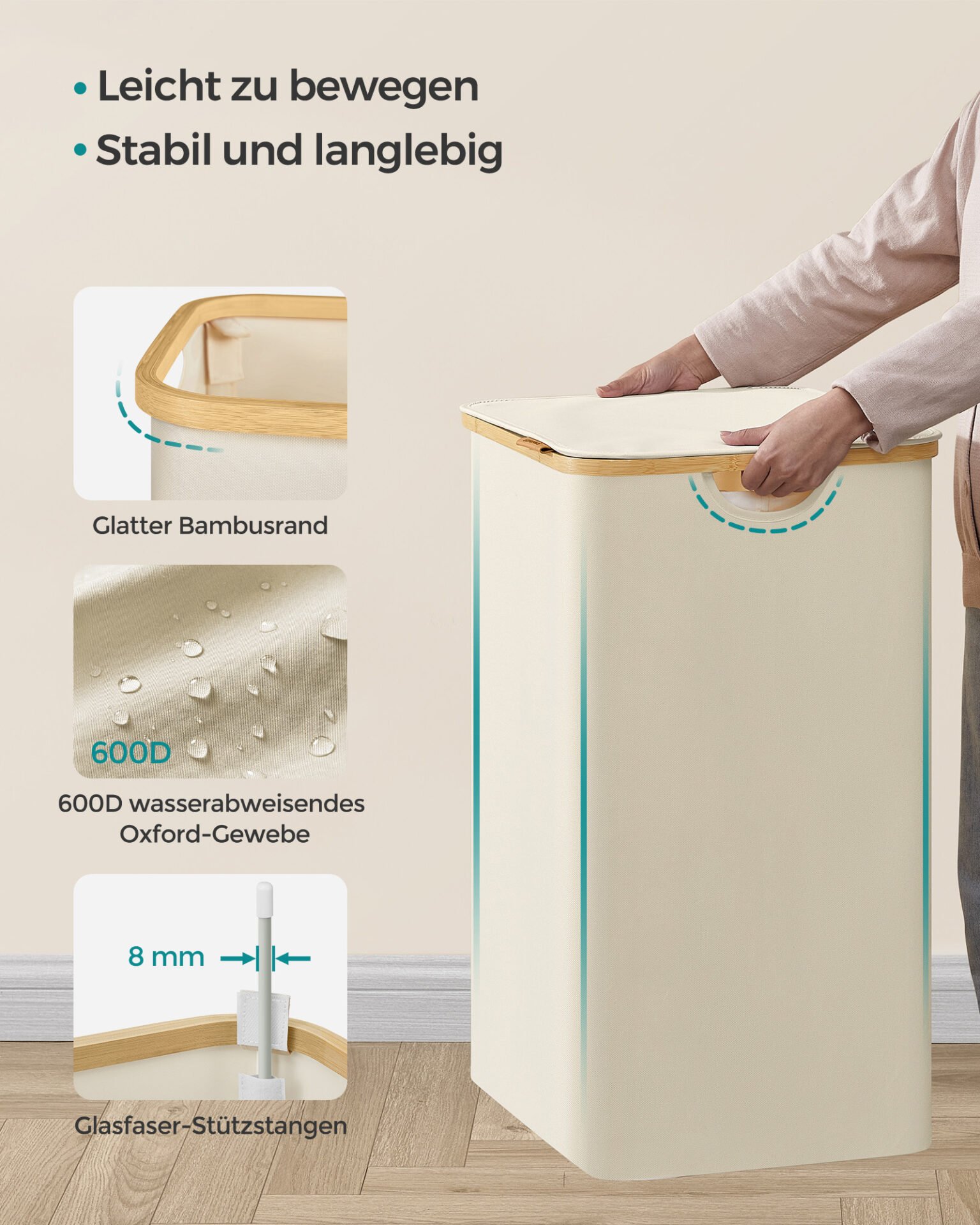 Tvättkorg med lock, 3-delad, (150 l), 23,6 x 15,2 x 27,8 tum, krämvitTvättkorg med lock, 3-delad, (150 l), 23,6 x 15,2 x 27,8 tum, krämvit