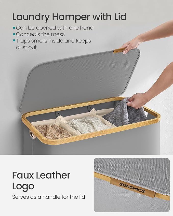 [Rymlig] Denna tvättkorg på 150L, ​​som mäter 60 x 38,5 x 70,5 cm och har 3 fack, är perfekt utformad för att sortera och förvara kläder för en familj med flera personer, vilket förenklar din tvättrutin.