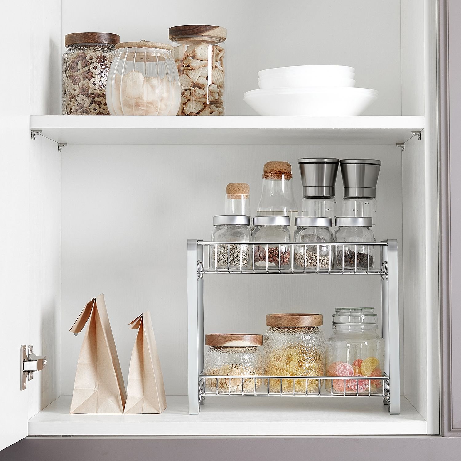I äppelpajordning: De smala flaskorna lutar ofta mot andra på grund av tråddesignen? Här kommer räddningen – 2 plasthyllor erbjuder plana ytor för flaskor med små fotavtryck. Nu kan allt stå rakt på denna kryddförvaring