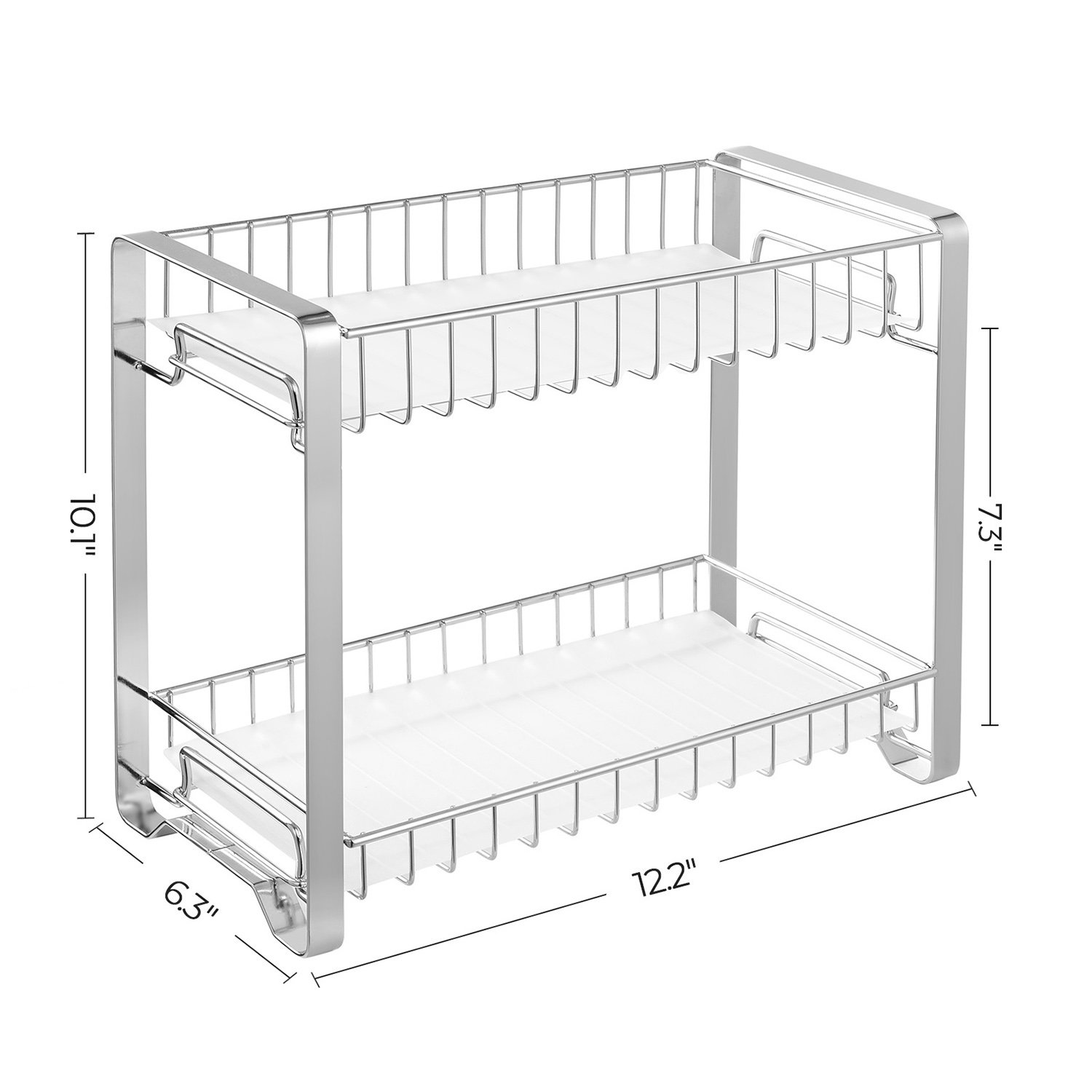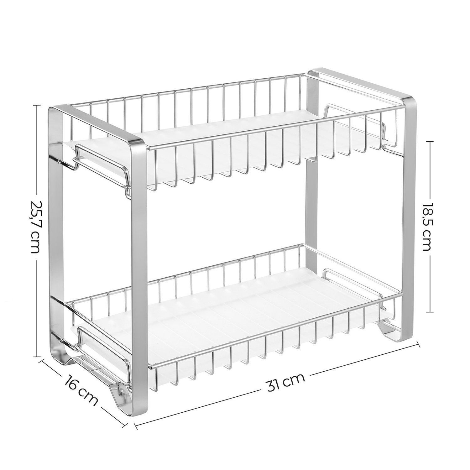 Specifikationer:Färg: SilverMaterial: StålProduktstorlek: 31 x 16 x 25,7 cm (L x B x H)Produktvikt: 0,9 kgFörpackningens innehåll:1 x Kryddhylla2 x Plasthylla4 x Halkfria fötter1 x Instruktioner (EN, DE, FR, ES, IT)