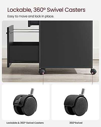 360° roterbara hjul med bromsfunktion: Det mobila multifunktionsskåpet är utrustat med fyra 360° hjul, så att du enkelt kan flytta det. Ännu bättre: De 2 främre hjulen med bromsfunktion håller den på plats vid behov.
