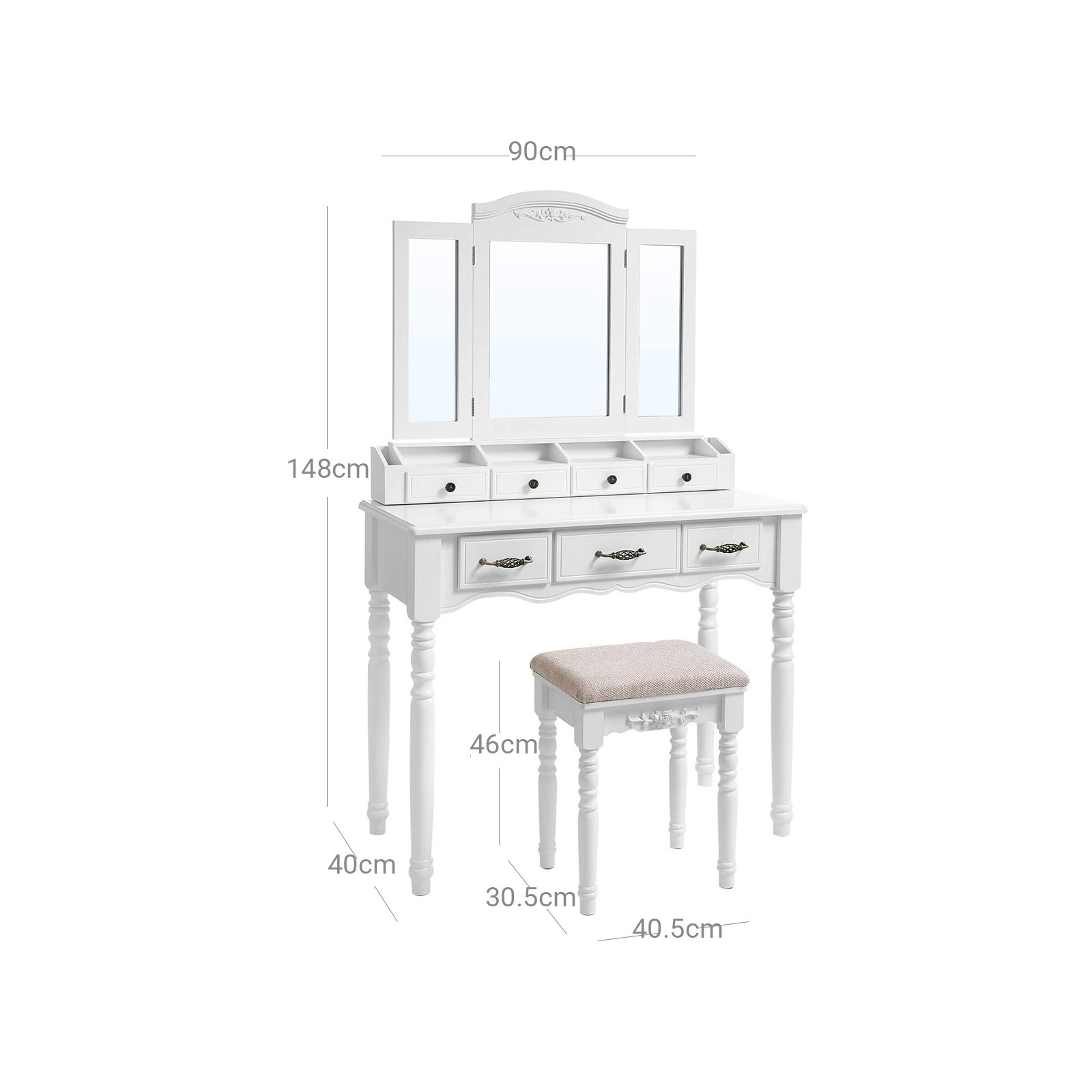 Specifications:- Colour: White- Material: MDF (Medium Density Fibreboard), Rubberwood, Pinewood- Vanity Table Size: 90 x 40 x 148 cm (L x W x H)- Stool Size: 40.5 x 30.5 x 46 cm (L x W x H)- Weight: 23.6 kg- Max. Static Load Capacity of the Stool: 130 kgPackage Contents:- 1 x Dressing Table- 1 x Cushioned Stool- 1 x Accessory Bag- 1 x Instructions (EN, DE, ES, FR, IT)
