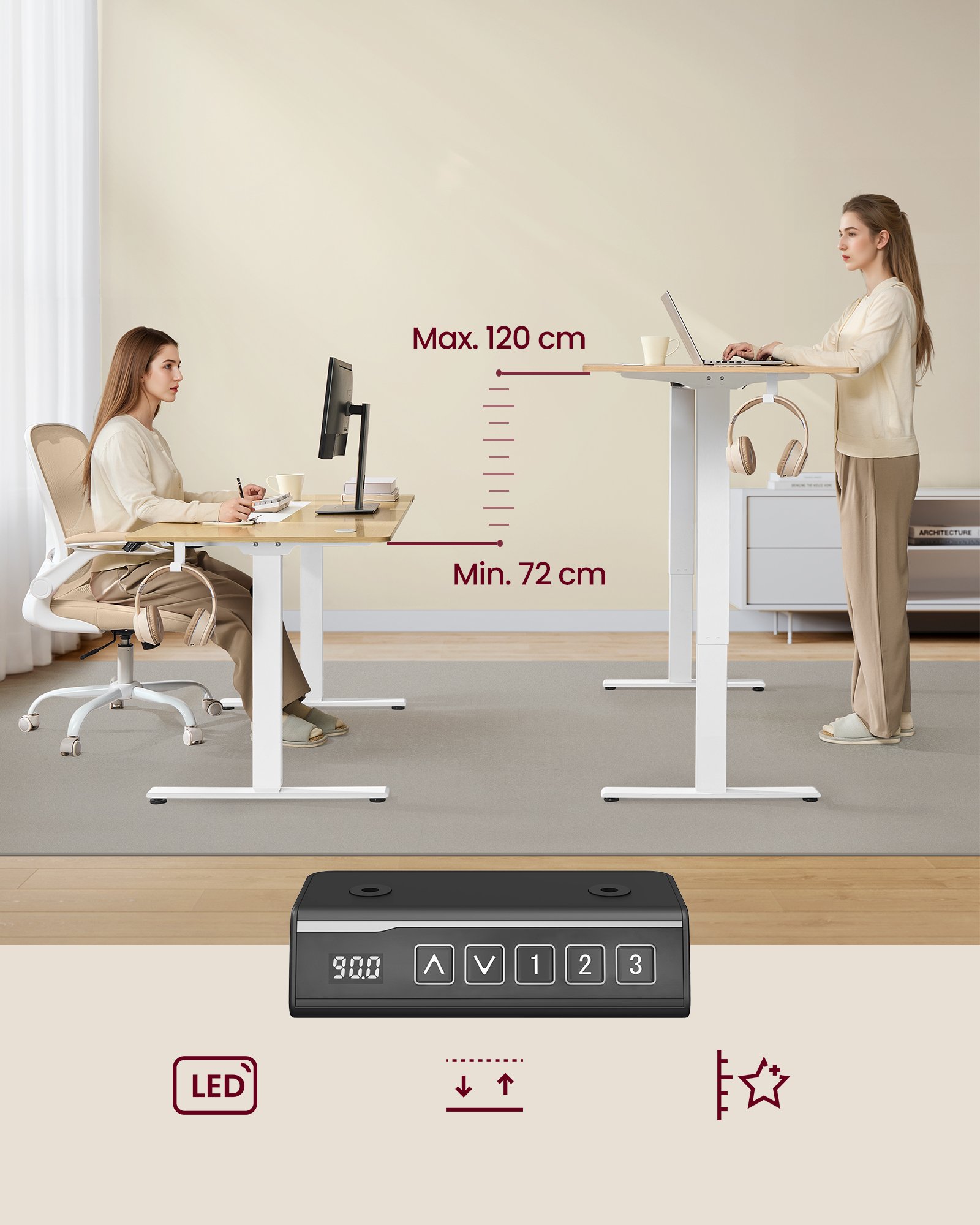 Flexible Height Adjustment: The height of the desk stand is adjustable from 72 to 120 cm. Thanks to the memory function, you can record three preferred heights and quickly switch from standing to sitting.