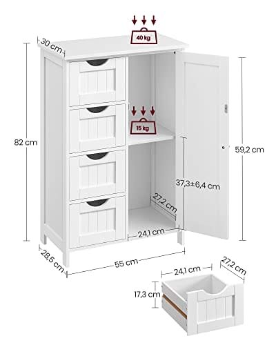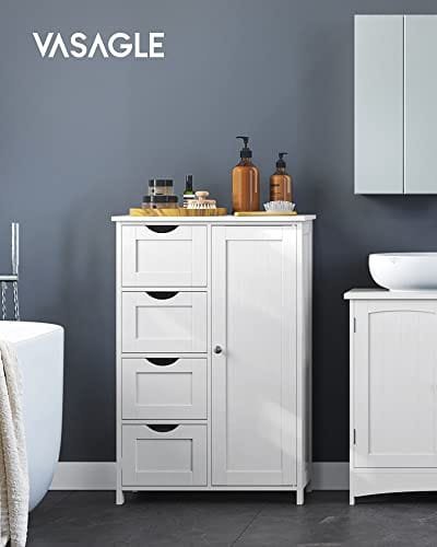 VASAGLE förvaringsskåp för badrumsgolv, träförvaringsenhet med 4 lådor, vit