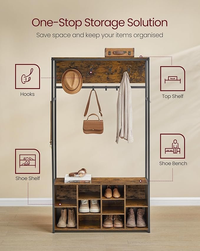 【MULTIFUNCTIONAL 4-IN-1 DESIGN】This versatile hall tree combines coat hooks, a top storage shelf, a shoe shelf, and a bench to optimise your space and help you create an organised and functional hallway