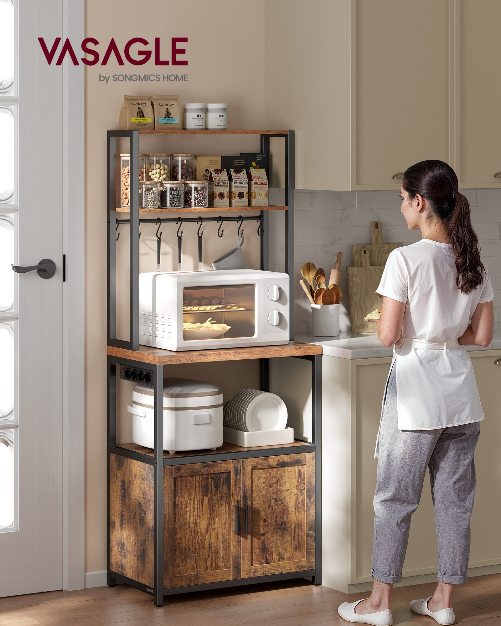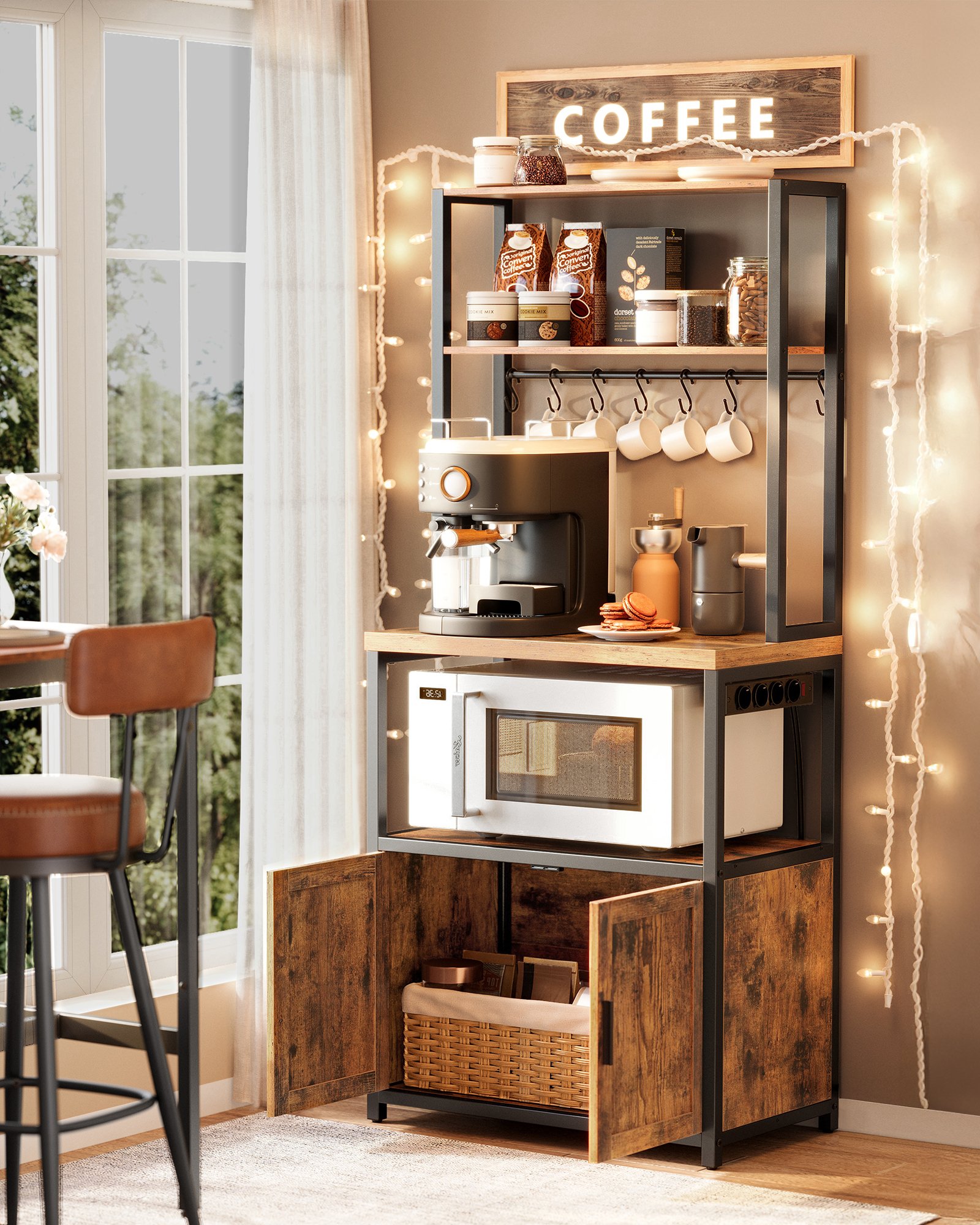 Spacious storage: with 2 shelves at the top for your spices, 8 hooks for hanging cups, a large tray for the coffee machine, a shelf at the bottom for the microwave and a large cupboard for storing fryer and tableware