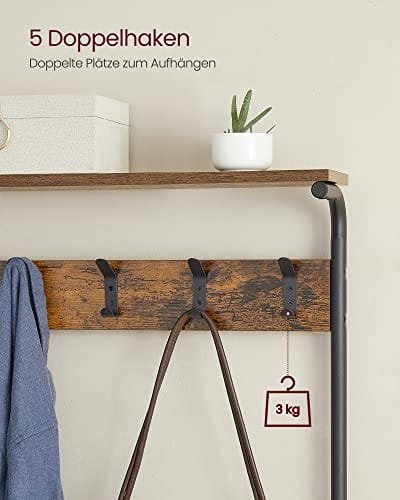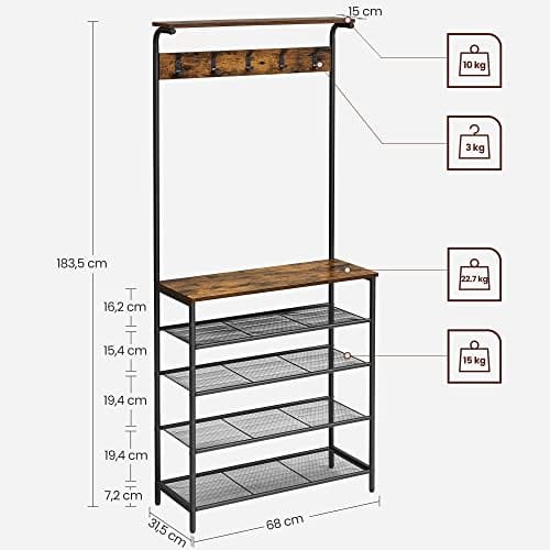 Specifikationer: Färg: Rustik brun, SvartMaterial: Spånskiva, Stål Produktstorlek: 12,4″D x 26,8″B x 72,2″H (31,5 x 68 x 183,5 cm) Den övre spånskivans panelstorlek: 26,8″ L x 5,9″ B x 0,6″ H (68 x 15 x 1,5 cm) Den nedre partikellådans panelstorlek: 26,8″ L x 11,8″ B x 0,6″ H (68 x 30 x 1,5 cm) Avstånd mellan varje hylla (uppifrån och ned): 6,4″ /6,1 ”/ 7,6 ”/7,6” (16,2/15,4/19,4/19,4 cm) Produktvikt: 21,4 lb (9, 7 kg) max. Statisk lastkapacitet för den övre spånskivan: max 22 lb (10 kg) Statisk lastkapacitet för varje krok: 6,6 lb (3 kg) max Statisk lastkapacitet för nedre spånskiva: 50 lb (22,7 kg) max. Statisk lastkapacitet per Näthylla: 33 lb (15 kg) Paketinnehåll: 1 x Hall Tree1 X Monteringssats1 X Tippskyddssats1 X Instruktioner
